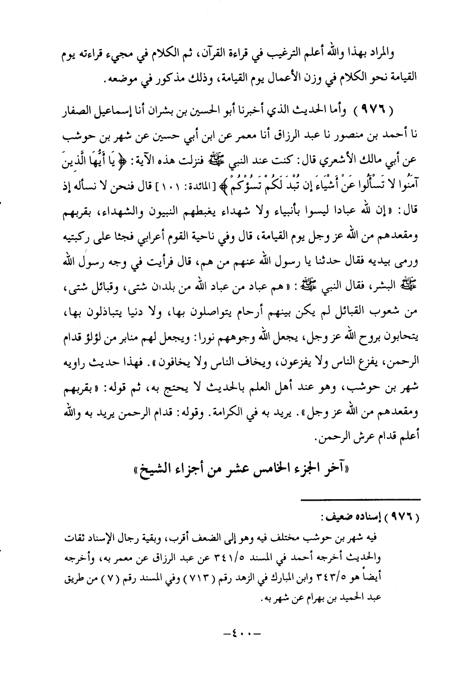 976 - وَأَمَّا الْحَدِيثُ الَّذِي أَخْبَرَنَا أَبُو الْحُسَيْنِ بْنُ بِشْرَانَ، أنا إِسْمَاعِيلُ الصَّفَّارُ، نا أَحْمَدُ بْنُ مَنْصُورٍ، نا عَبْدُ الرَّزَّاقِ، أنا مَعْمَرٌ، عَنِ ابْنِ أَبِي حُسَيْنٍ، عَنْ شَهْرِ بْنِ حَوْشَبٍ، عَنْ أَبِي مَالِكٍ الْأَشْعَرِيِّ، قَالَ: كُنْتُ عِنْدَ النَّبِيِّ صَلَّى اللهُ عَلَيْهِ وَسَلَّمَ فَنَزَلَتْ هَذِهِ الْآيَةُ: {يَا أَيُّهَا الَّذِينَ آمَنُوا لَا تَسْأَلُوا عَنْ أَشْيَاءَ إِنْ تُبْدَ لَكُمْ تَسُؤْكُمْ} [المائدة: 101] . قَالَ: فَنَحْنُ لَا نَسْأَلُهُ إِذْ قَالَ: «إِنَّ §لِلَّهِ عِبَادًا لَيْسُوا بِأَنْبِيَاءَ وَلَا شُهَدَاءَ يَغْبِطُهُمُ النَّبِيُّونَ وَالشُّهَدَاءُ بِقُرْبِهِمْ وَمَقْعَدِهِمْ مِنَ اللَّهِ عَزَّ وَجَلَّ يَوْمَ الْقِيَامَةِ» . قَالَ: وَفِي نَاحِيَةِ الْقَوْمِ أَعْرَابِيٌّ فَجَثَا عَلَى رُكْبَتَيْهِ، وَرَمَى بِيَدَيْهِ فَقَالَ: حَدِّثْنَا يَا رَسُولَ اللَّهِ عَنْهُمْ مَنْ هُمْ؟ قَالَ: فَرَأَيْتُ فِيَ وَجْهِ رَسُولِ اللَّهِ صَلَّى اللهُ عَلَيْهِ وَسَلَّمَ الْبِشْرَ، فَقَالَ النَّبِيُّ صَلَّى اللهُ عَلَيْهِ وَسَلَّمَ: «هُمْ عَبَّادٌ مِنْ عَبَّادِ اللَّهِ مِنْ بُلْدَانٍ شَتَّى، وَقَبَائِلَ شَتَّى، مِنْ شُعُوبِ الْقَبَائِلِ لَمْ يَكُنْ بَيْنَهُمْ أَرْحَامٌ يَتَوَاصَلُونَ بِهَا، وَلَا دُنْيَا يَتَبَاذَلُونَ بِهَا، يَتَحَابُّونَ بِرُوحِ اللَّهِ عَزَّ وَجَلَّ، يَجْعَلُ اللَّهُ وُجُوهَهُمْ نُورًا، وَيَجْعَلُ لَهُمْ مَنَابِرَ مِنْ لُؤْلُؤٍ قُدَّامَ الرَّحْمَنِ، يَفْزَعُ النَّاسُ وَلَا يَفْزَعُونَ، وَيَخَافُ النَّاسُ وَلَا يَخَافُونَ» . فَهَذَا حَدِيثٌ رَاوِيهِ شَهْرُ بْنُ حَوْشَبٍ، وَهُوَ عِنْدَ أَهْلِ الْعِلْمِ بِالْحَدِيثِ لَا يُحْتَجُّ بِهِ، ثُمَّ قَوْلُهُ: «بِقُرْبِهِمْ وَمَقْعَدِهِمْ مِنَ اللَّهِ عَزَّ وَجَلَّ» . يُرِيدُ بِهِ فِي الْكَرَامَةِ. وَقَوْلُهُ: «قُدَّامَ الرَّحْمَنِ» يُرِيدُ بِهِ، وَاللَّهُ أَعْلَمُ: قُدَّامَ عَرْشِ الرَّحْمَنِ