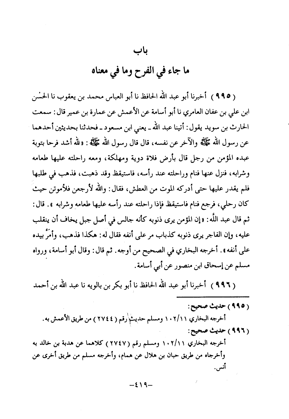 995 - أَخْبَرَنَا أَبُو عَبْدِ اللَّهِ الْحَافِظُ نا أَبُو الْعَبَّاسِ مُحَمَّدُ بْنُ يَعْقُوبَ، نا الْحَسَنُ بْنُ عَلِيِّ بْنِ عَفَّانَ الْعَامِرِيُّ، نَا أَبُو أُسَامَةَ، عَنِ الْأَعْمَشِ، عَنْ عُمَارَةَ بْنِ عُمَيْرٍ، قَالَ: سَمِعْتُ الْحَارِثَ بْنَ سُوَيْدٍ، يَقُولُ: أَتَيْنَا عَبْدَ اللَّهِ يَعْنِي ابْنَ مَسْعُودٍ فَحَدَّثَنَا بِحَدِيثَيْنِ أَحَدِهُمَا عَنْ رَسُولِ اللَّهِ صَلَّى اللهُ عَلَيْهِ وَسَلَّمَ، وَالْآخَرُ عَنْ نَفْسِهِ، قَالَ: قَالَ رَسُولُ اللَّهِ صَلَّى اللهُ عَلَيْهِ وَسَلَّمَ: §" لَلَّهُ أَشَدُّ فَرَحًا بِتَوْبَةِ عَبْدِهِ الْمُؤْمِنِ مِنْ رَجُلٍ قَالَ بِأَرْضِ فَلَاةٍ دَوِيَّةٍ وَمُهْلِكَةٍ، وَمَعَهُ رَاحِلَتُهُ عَلَيْهَا طَعَامُهُ وَشَرَابُهُ، فَنَزَلَ عَنْهَا فَنَامَ وَرَاحِلَتُهُ عِنْدَ رَأْسِهِ، فَاسْتَيْقَظَ وَقَدْ ذَهَبَتْ، فَذَهَبَ فِي طَلَبِهَا فَلَمْ يَقْدِرْ عَلَيْهَا حَتَّى أَدْرَكَهُ الْمَوْتُ مِنَ الْعَطَشِ، فَقَالَ: وَاللَّهِ لَأَرْجِعَنَّ فَلَأَمُوتَنَّ حَيْثُ كَانَ رَحْلِي، فَرَجَعَ فَنَامَ فَاسْتَيْقَظَ فَإِذَا رَاحِلَتُهُ عِنْدَ رَأْسِهِ، عَلَيْهَا طَعَامُهُ وَشَرَابُهُ ". قَالَ: ثُمَّ قَالَ عَبْدُ اللَّهِ: إِنَّ الْمُؤْمِنَ يَرَى ذُنُوبَهُ كَأَنَّهُ جَالِسٌ فِي أَصْلِ جَبَلٍ يَخَافُ أَنْ يَنْقَلِبَ عَلَيْهِ، وَإِنَّ الْفَاجِرَ يَرَى ذُنُوبَهُ كَذُبَابٍ مَرَّ عَلَى أَنْفِهِ فَقَالَ لَهُ: هَكَذَا فَذَهَبَ، وَأَمَرَّ بِيَدِهِ عَلَى أَنْفِهِ. أَخْرَجَهُ الْبُخَارِيُّ فِي الصَّحِيحِ مِنْ أَوْجُهٍ. ثُمَّ قَالَ: وَقَالَ أَبُو أُسَامَةَ، وَرَوَاهُ مُسْلِمٌ عَنْ إِسْحَاقَ بْنِ مَنْصُورٍ عَنْ أَبِي أُسَامَةَ