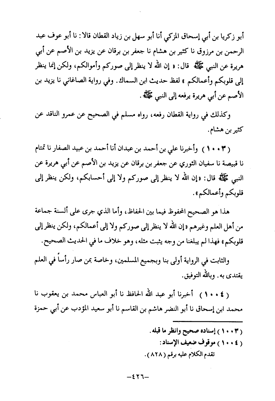 1003 - وَأَخْبَرَنَا عَلِيُّ بْنُ أَحْمَدَ بْنِ عَبْدَانِ، أنا أَحْمَدُ بْنُ عُبَيْدِ الصَّفَّارِ، نا تَمْتَامٌ، نا قَبِيصَةُ، نا سُفْيَانُ الثَّوْرِيُّ، عَنْ جَعْفَرِ بْنِ بُرْقَانَ، عَنْ يَزِيدَ بْنِ الْأَصَمِّ، عَنْ أَبِي هُرَيْرَةَ، عَنِ النَّبِيِّ صَلَّى اللهُ عَلَيْهِ وَسَلَّمَ قَالَ: «إِنَّ اللَّهَ §لَا يَنْظُرُ إِلَى صُوَرِكُمْ وَلَا إِلَى أَحْسَابِكُمْ، وَلَكِنْ يَنْظُرُ إِلَى قُلُوبِكُمْ وَأَعْمَالِكُمْ» . هَذَا هُوَ الصَّحِيحُ الْمَحْفُوظُ فِيمَا بَيْنَ الْحُفَّاظِ، وَأَمَّا الَّذِي جَرَى عَلَى أَلْسِنَةِ جَمَاعَةٍ مِنْ أَهْلِ الْعِلْمِ وَغَيْرِهِمْ: «إِنَّ اللَّهَ لَا يَنْظُرُ إِلَى صُوَرِكُمْ وَلَا إِلَى أَعْمَالِكُمْ، وَلَكِنْ يَنْظُرُ إِلَى قُلُوبِكُمْ» فَهَذَا لَمْ يَبْلُغْنَا مِنْ وَجْهٍ يُثْبِتُ مِثْلَهُ، وَهُوَ خِلَافُ مَا فِي الْحَدِيثِ الصَّحِيحِ. وَالثَّابِتُ فِي الرِّوَايَةِ أَوْلَى بِنَا وَبِجَمِيعِ الْمُسْلِمِينَ، وَخَاصَّةً بِمَنْ صَارَ رَأْسًا فِي الْعِلْمِ يُقْتَدَى بِهِ، وَبِاللَّهِ التَّوْفِيقُ