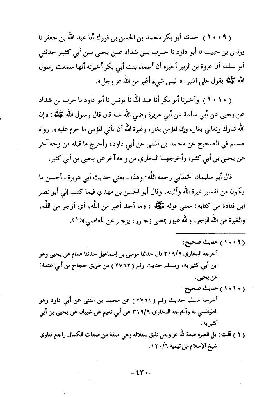 1010 - وَأَخْبَرَنَا أَبُو بَكْرٍ، أنا عَبْدُ اللَّهِ، نا يُونُسُ، نا أَبُو دَاوُدَ، نا حَرْبُ بْنُ شَدَّادٍ، عَنْ يَحْيَى، عَنْ أَبِي سَلَمَةَ، عَنْ أَبِي هُرَيْرَةَ، رَضِيَ اللَّهُ عَنْهُ قَالَ: قَالَ رَسُولُ اللَّهِ صَلَّى اللهُ عَلَيْهِ وَسَلَّمَ: «إِنَّ §اللَّهَ تَبَارَكَ وَتَعَالَى يَغَارُ، وَإِنَّ الْمُؤْمِنَ يَغَارُ، وَغَيْرَةُ اللَّهِ أَنْ يَأْتِيَ الْمُؤْمِنُ مَا حَرَّمَ عَلَيْهِ» . رَوَاهُ مُسْلِمٌ فِي الصَّحِيحِ عَنْ مُحَمَّدِ بْنِ الْمُثَنَّى عَنْ أَبِي دَاوُدَ، وَأَخْرَجَ مَا قَبْلَهُ مِنْ وَجْهٍ آخَرَ، عَنْ يَحْيَى بْنِ أَبِي كَثِيرٍ، وَأَخْرَجَهُمَا الْبُخَارِيُّ مِنْ وَجْهٍ آخَرَ، عَنْ يَحْيَى بْنِ أَبِي كَثِيرٍ. قَالَ أَبُو سُلَيْمَانَ الْخَطَّابِيُّ رَحِمَهُ اللَّهُ: «وَهَذَا ـ يَعْنِي حَدِيثَ أَبِي هُرَيْرَةَ ـ أَحْسَنُ مَا يَكُونُ مِنْ تَفْسِيرِ غَيْرَةِ اللَّهِ وَأَثْبَتُهُ» . وَقَالَ أَبُو الْحَسَنِ بْنُ مَهْدِيٍّ فِيمَا كَتَبَ إِلَيَّ أَبُو نَصْرِ بْنُ قَتَادَةَ مِنْ كِتَابِهِ: " مَعْنَى قَوْلِهِ صَلَّى اللهُ عَلَيْهِ وَسَلَّمَ: «مَا أَحَدٌ أَغْيَرَ مِنَ اللَّهِ» ، أَيْ: أَزْجَرُ مِنَ اللَّهِ، وَالْغَيْرَةُ مِنَ اللَّهِ الزَّجْرُ، وَاللَّهُ غَيُورٌ بِمَعْنَى زَجُورٌ، يَزْجُرُ عَنِ الْمَعَاصِي "