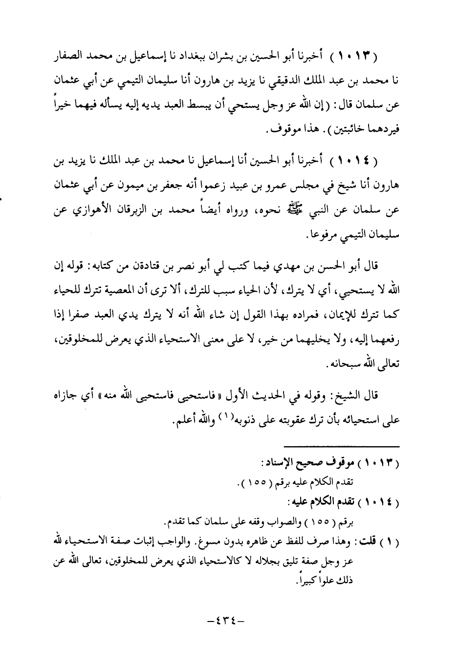 1014 - أَخْبَرَنَا أَبُو الْحُسَيْنِ، أَنَا إِسْمَاعِيلُ، نا مُحَمَّدُ بْنُ عَبْدِ الْمَلِكِ، نا يَزِيدُ بْنُ هَارُونَ، أَنَا شَيْخٌ فِي مَجْلِسِ عَمْرِو بْنِ عُبَيْدٍ زَعَمُوا أَنَّهُ جَعْفَرُ بْنُ مَيْمُونٍ، عَنْ أَبِي عُثْمَانَ، عَنْ سَلْمَانَ، عَنِ النَّبِيِّ صَلَّى اللهُ عَلَيْهِ وَسَلَّمَ نَحْوَهُ، وَرَوَاهُ أَيْضًا مُحَمَّدُ بْنُ الزِّبْرِقَانِ الْأَهْوَازِيُّ عَنْ سُلَيْمَانَ التَّيْمِيِّ مَرْفُوعًا. قَالَ أَبُو الْحَسَنِ بْنُ مَهْدِيٍّ فِيمَا كَتَبَ لِي أَبُو نَصْرِ بْنُ قَتَادَةَ مِنْ كِتَابِهِ: " قَوْلُهُ: {إِنَّ اللَّهَ لَا يَسْتَحْيِي} [البقرة: 26] ، أَيْ: لَا يَتْرُكُ، لِأَنَّ الْحَيَاءَ سَبَبٌ لِلتَّرْكِ، أَلَا تَرَى أَنَّ الْمَعْصِيَةَ تُتْرَكُ لِلْحَيَاءِ كَمَا تُتْرَكُ لِلْإِيمَانِ، فَمُرَادُهُ بِهَذَا الْقَوْلِ إِنَّ شَاءَ اللَّهُ: أَنَّهُ لَا يَتْرُكُ يَدَيِ الْعَبْدِ صِفْرًا إِذَا رَفَعَهُمَا إِلَيْهِ، وَلَا يُخْلِيهُمَا مِنْ خَيْرٍ، لَا عَلَى مَعْنَى الِاسْتِحْيَاءِ الَّذِي يَعْرِضُ لِلْمَخْلُوقِينَ تَعَالَى اللَّهُ سُبْحَانَهُ ". قَالَ الشَّيْخُ: وَقَوْلُهُ فِي الْحَدِيثِ الْأَوَّلِ: «فَاسْتَحْيَى فَاسْتَحْيَى اللَّهُ مِنْهُ» . أَيْ: جَازَاهُ عَلَى اسْتِحْيَائِهِ بِأَنْ تَرَكَ عُقُوبَتَهُ عَلَى ذُنُوبِهِ وَاللَّهُ أَعْلَمُ