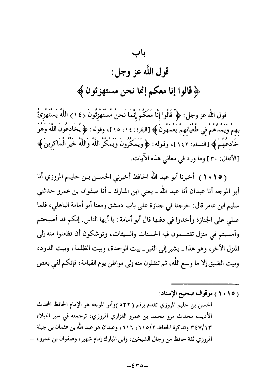 §بَابُ قَوْلِ اللَّهِ عَزَّ وَجَلَّ: {قَالُوا إِنَّا مَعَكُمْ إِنَّمَا نَحْنُ مُسْتَهْزِئُونَ} قَوْلُ اللَّهِ عَزَّ وَجَلَّ: {قَالُوا إِنَّا مَعَكُمْ إِنَّمَا نَحْنُ مُسْتَهْزِئُونَ اللَّهُ يَسْتَهْزِئُ بِهِمْ وَيَمُدُّهُمْ فِي طُغْيَانِهِمْ يَعْمَهُونَ} ، وَقَوْلُهُ: {يُخَادِعُونَ اللَّهَ وَهُوَ خَادِعُهُمْ} [النساء: 142] ، وَقَوْلُهُ: {وَيَمْكُرُونَ وَيَمْكُرُ اللَّهُ وَاللَّهُ خَيْرُ الْمَاكِرِينَ} [الأنفال: 30] وَمَا وَرَدَ فِي مَعَانِي هَذِهِ الْآيَاتِ