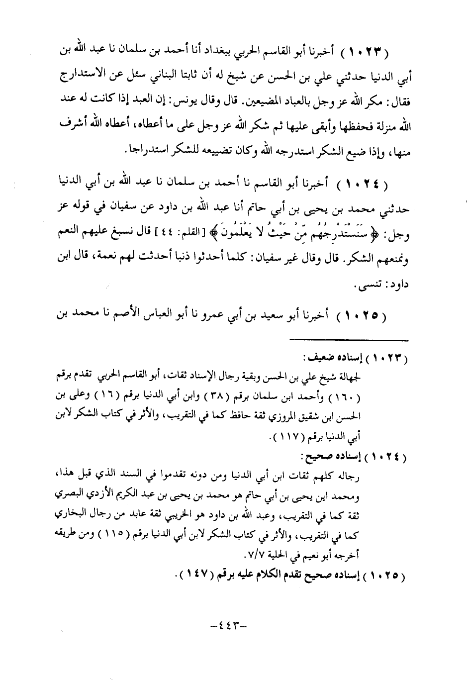 1024 - أَخْبَرَنَا أَبُو الْقَاسِمِ، نا أَحْمَدُ بْنُ سَلْمَانَ، نا عَبْدُ اللَّهِ بْنُ أَبِي الدُّنْيَا، حَدَّثَنِي مُحَمَّدُ بْنُ يَحْيَى بْنِ أَبِي حَاتِمٍ، أنا عَبْدُ اللَّهِ بْنُ دَاوُدَ، عَنْ سُفْيَانَ، فِي قَوْلِهِ عَزَّ وَجَلَّ: {سَنَسْتَدْرِجُهُمْ مِنْ حَيْثُ لَا يَعْلَمُونَ} [الأعراف: 182] قَالَ: §نُسْبِغُ عَلَيْهِمِ النِّعَمَ وَنَمْنَعُهُمُ الشُّكْرَ. قَالَ: وَقَالَ غَيْرُ سُفْيَانَ: كُلَّمَا أَحْدَثُوا ذَنْبًا أَحْدَثْتُ لَهُمْ نِعْمَةً. قَالَ ابْنُ دَاوُدَ: تَنْسَى