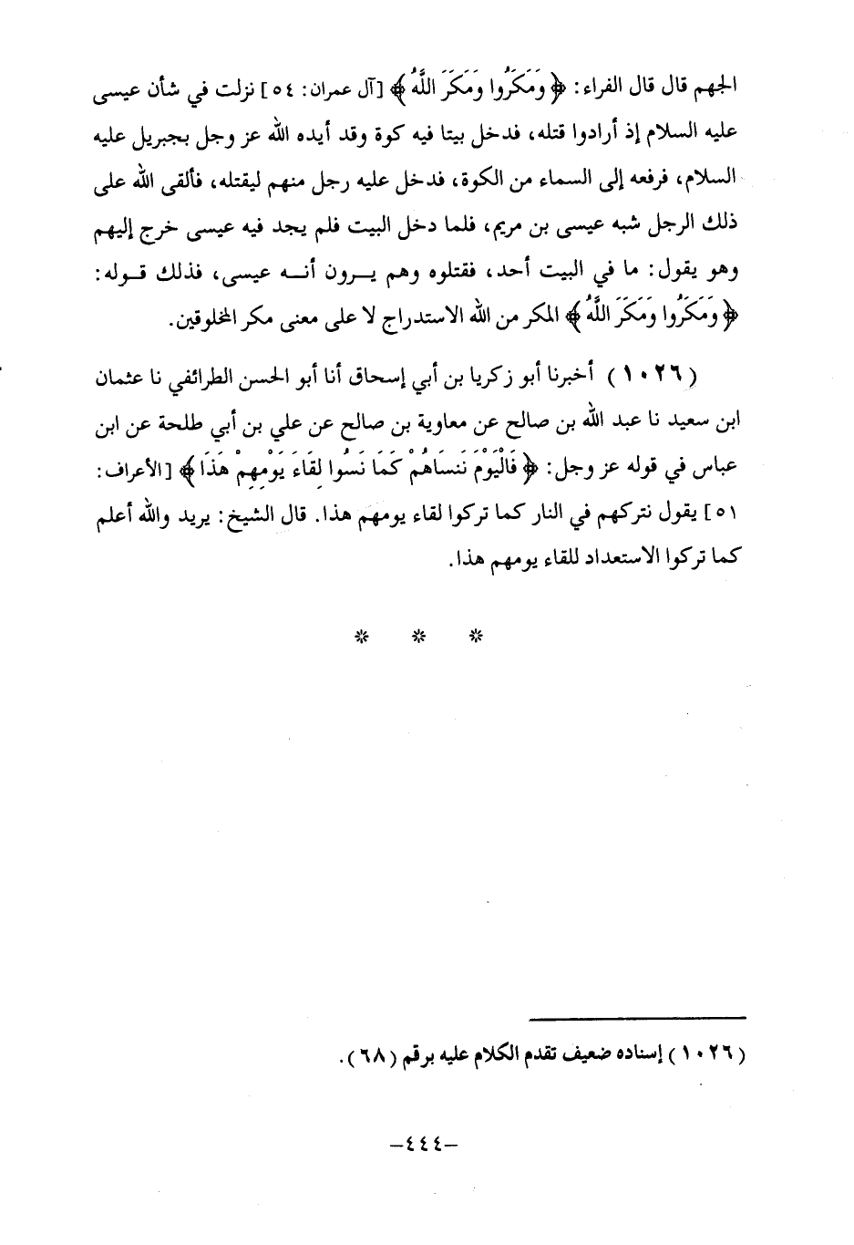 1026 - أَخْبَرَنَا أَبُو زَكَرِيَّا بْنُ أَبِي إِسْحَاقَ، أنا أَبُو الْحَسَنِ الطَّرَائِفِيُّ، نا عُثْمَانُ بْنُ سَعِيدٍ، نا عَبْدُ اللَّهِ بْنُ صَالِحٍ، عَنْ مُعَاوِيَةَ بْنِ صَالِحٍ، عَنْ عَلِيِّ بْنِ أَبِي طَلْحَةَ، عَنِ ابْنِ عَبَّاسٍ، فِي قَوْلِهِ عَزَّ وَجَلَّ: {فَالْيَوْمَ نَنْسَاهُمْ كَمَا نَسُوا لِقَاءَ يَوْمِهِمْ هَذَا} [الأعراف: 51] يَقُولُ: §نَتْرُكُهُمْ فِي النَّارِ كَمَا تَرَكُوا لِقَاءَ يَوْمِهِمْ هَذَا ". قَالَ الشَّيْخُ: يُرِيدُ وَاللَّهُ أَعْلَمُ: كَمَا تَرَكُوا الِاسْتِعْدَادَ لِلِقَاءِ يَوْمِهِمْ هَذَا