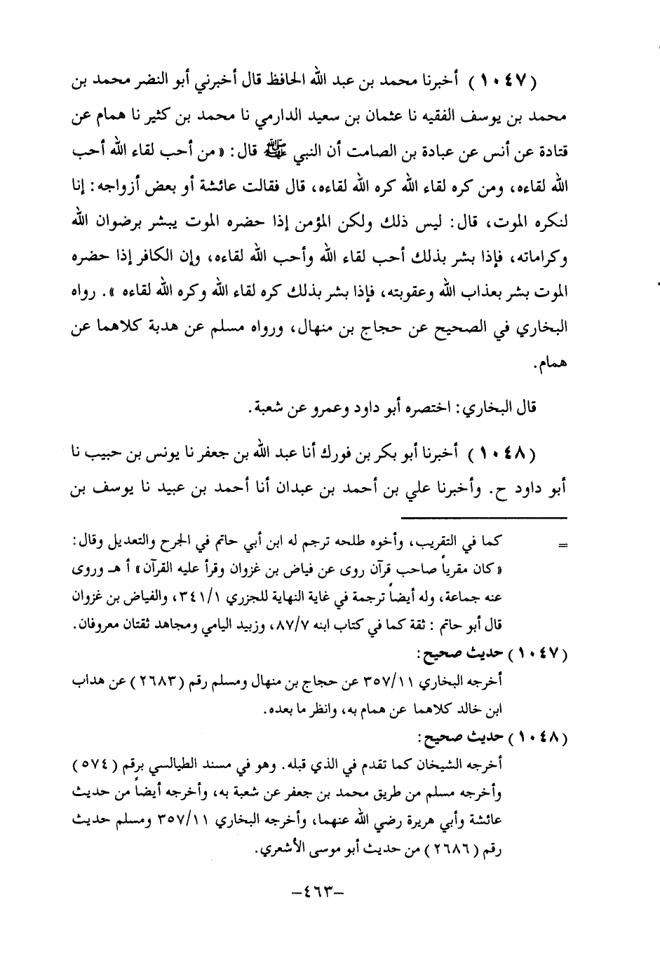 1047 - أَخْبَرَنَا مُحَمَّدُ بْنُ عَبْدِ اللَّهِ الْحَافِظُ، قَالَ: أَخْبَرَنِي أَبُو النَّضْرِ مُحَمَّدُ بْنُ مُحَمَّدِ بْنِ يُوسُفَ الْفَقِيهُ، نا عُثْمَانُ بْنُ سَعِيدٍ الدَّارِمِيُّ، نا مُحَمَّدُ بْنُ كَثِيرٍ، نا هَمَّامٌ، عَنْ قَتَادَةَ، عَنْ أَنَسٍ، عَنْ عُبَادَةَ بْنِ الصَّامِتِ، أَنَّ النَّبِيَّ صَلَّى اللهُ عَلَيْهِ وَسَلَّمَ قَالَ: «§مَنْ أَحَبَّ لِقَاءَ اللَّهِ أَحَبَّ اللَّهُ لِقَاءَهُ، وَمَنْ كَرِهَ لِقَاءَ اللَّهِ كَرِهَ اللَّهُ لِقَاءَهُ» . قَالَ: فَقَالَتْ عَائِشَةُ أَوْ بَعْضُ أَزْوَاجِهِ: إِنَّا لَنَكْرَهُ الْمَوْتَ. قَالَ: «لَيْسَ ذَلِكَ، وَلَكِنِ الْمُؤْمِنُ إِذَا حَضَرَهُ الْمَوْتُ يُبَشَّرُ بِرِضْوَانِ اللَّهِ وَكَرَامَاتِهِ، فَإِذَا بُشِّرَ بِذَلِكَ أَحَبَّ لِقَاءَ اللَّهِ وَأَحَبَّ اللَّهُ لِقَاءَهُ، وَإِنَّ الْكَافِرَ إِذَا حَضَرَهُ الْمَوْتُ بُشِّرَ بِعَذَابِ اللَّهِ وَعُقُوبَتِهِ، فَإِذَا بُشِّرَ بِذَلِكَ كَرِهَ لِقَاءَ اللَّهِ وَكَرِهَ اللَّهُ لِقَاءَهُ» . رَوَاهُ الْبُخَارِيُّ فِي الصَّحِيحِ عَنْ حَجَّاجِ بْنِ مِنْهَالٍ، وَرَوَاهُ مُسْلِمٌ عَنْ هُدْبَةَ كِلَاهُمَا عَنْ هَمَّامٍ. قَالَ الْبُخَارِيُّ: اخْتَصَرَهُ أَبُو دَاوُدَ وَعَمْرٌو عَنْ شُعْبَةَ
