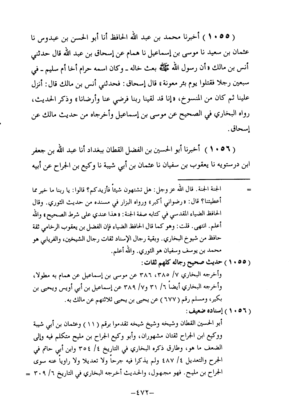 1055 - أَخْبَرَنَا مُحَمَّدُ بْنُ عَبْدِ اللَّهِ الْحَافِظُ، أنا أَبُو الْحَسَنِ بْنُ عَبْدُوسٍ، نا عُثْمَانُ بْنُ سَعِيدٍ، نا مُوسَى بْنُ إِسْمَاعِيلَ، نا هَمَّامٌ، عَنْ إِسْحَاقَ بْنِ عَبْدِ اللَّهِ، قَالَ: حَدَّثَنِي أَنَسُ بْنُ مَالِكٍ، أَنَّ رَسُولَ اللَّهِ صَلَّى اللهُ عَلَيْهِ وَسَلَّمَ بَعَثَ خَالَهُ، وَكَانَ اسْمُهُ حَرَامًا أَخَا أُمِّ سُلَيْمٍ ـ فِي سَبْعِينَ رَجُلًا، فَقُتِلُوا يَوْمَ بِئْرِ مَعُونَةَ، قَالَ إِسْحَاقُ: فَحَدَّثَنِي أَنَسُ بْنُ مَالِكٍ قَالَ: §أُنْزِلَ عَلَيْنَا ثُمَّ كَانَ مِنَ الْمَنْسُوخِ، إِنَّا قَدْ لَقِينَا رَبَّنَا فَرَضِيَ عَنَّا وَأَرْضَانَا. وَذَكَرَ الْحَدِيثَ. رَوَاهُ الْبُخَارِيُّ فِي الصَّحِيحِ عَنْ مُوسَى بْنِ إِسْمَاعِيلَ، وَأَخْرَجَاهُ مِنْ حَدِيثِ مَالِكٍ عَنْ إِسْحَاقَ