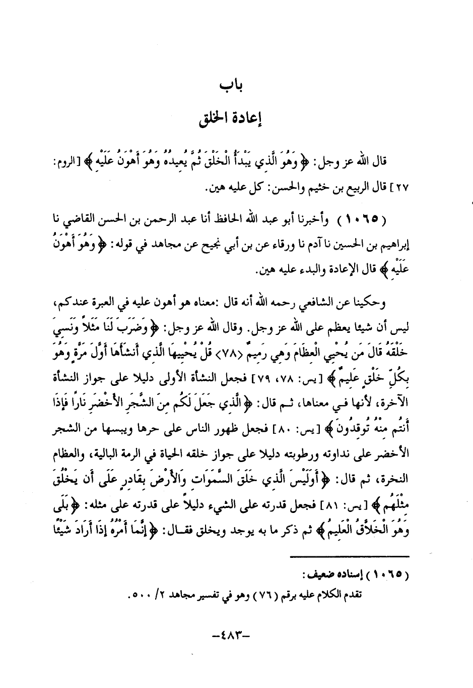 1065 - وَأَخْبَرَنَا أَبُو عَبْدِ اللَّهِ الْحَافِظُ، أنا عَبْدُ الرَّحْمَنِ بْنُ الْحَسَنِ الْقَاضِي، نا إِبْرَاهِيمُ بْنُ الْحُسَيْنِ، نا آدَمُ، نا وَرْقَاءُ، عَنِ ابْنِ أَبِي نَجِيحٍ، عَنْ مُجَاهِدٍ، فِي قَوْلِهِ: {وَهُوَ أَهْوَنُ عَلَيْهِ} [الروم: 27] قَالَ: §الْإِعَادَةُ وَالْبَدْءُ عَلَيْهِ هَيِّنٌ. " وَحُكِينَا عَنِ الشَّافِعِيِّ رَحِمَهُ اللَّهُ أَنَّهُ قَالَ: مَعْنَاهُ: هُوَ أَهْوَنُ عَلَيْهِ فِي الْعِبْرَةِ عِنْدَكُمْ، لَيْسَ أَنَّ شَيْئًا يَعْظُمُ عَلَى اللَّهِ عَزَّ وَجَلَّ " وَقَالَ اللَّهُ عَزَّ وَجَلَّ: {وَضَرَبَ لَنَا مِثْلًا وَنَسِيَ خَلْقَهُ قَالَ مَنْ يُحْيِي الْعِظَامَ وَهِيَ رَمِيمٌ قُلْ يُحْيِيهَا الَّذِي أَنْشَأَهَا أَوَّلَ مَرَّةٍ وَهُوَ بِكُلِّ خَلْقٍ عَلِيمٌ} [يس: 79] فَجَعَلَ النَّشْأَةَ الْأُولَى دَلِيلًا عَلَى جَوَازِ النَّشْأَةِ الْآخِرَةِ، لِأَنَّهَا فِي مَعْنَاهَا، ثُمَّ قَالَ: {الَّذِي جَعَلَ لَكُمْ مِنَ الشَّجَرِ الْأَخْضَرِ نَارًا فَإِذَا أَنْتُمْ مِنْهُ تُوقِدُونَ} [يس: 80] فَجَعَلَ ظُهُورَ النَّاسِ عَلَى حَرِّهَا وَيَبَسِهَا مِنَ الشَّجَرِ الْأَخْضَرِ عَلَى نَدَاوَتِهِ وَرُطُوبَتِهِ دَلِيلًا عَلَى جَوَازِ خَلْقِهِ الْحَيَاةَ فِي الرِّمَّةِ الْبَالِيَةِ، وَالْعِظَامِ النَّخِرَةِ، ثُمَّ قَالَ: {أَوَلَيْسَ الَّذِي خَلَقَ السَّمَاوَاتِ وَالْأَرْضَ بِقَادِرٍ عَلَى أَنْ يَخْلُقَ مِثْلَهُمْ} [يس: 81] فَجَعَلَ قُدْرَتَهُ عَلَى الشَّيْءِ دَلِيلًا عَلَى قُدْرَتِهِ عَلَى مِثْلِهِ: {بَلَى وَهُوَ الْخَلَّاقُ الْعَلِيمُ} [يس: 81] ثُمَّ ذَكَرَ مَا بِهِ يُوجَدُ وَيُخْلَقُ فَقَالَ: {إِنَّمَا أَمْرُهُ إِذَا أَرَادَ شَيْئًا -[484]- أَنْ يَقُولَ لَهُ كُنْ فَيَكُونُ} [يس: 82] وَهَذَا مَعْنًى يَجْمَعُ الْبَدْأَةَ وَالْإِعَادَةَ، وَآيَاتُ الْقُرْآنِ فِي إِثْبَاتِ الْإِعَادَةِ كَثِيرَةٌ