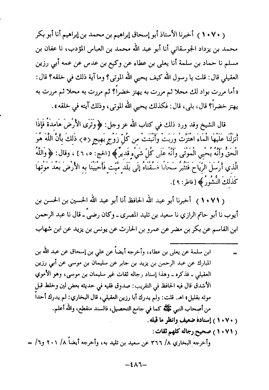 1070 - أَخْبَرَنَا الْأُسْتَاذُ أَبُو إِسْحَاقَ إِبْرَاهِيمُ بْنُ مُحَمَّدِ بْنِ إِبْرَاهِيمَ، أنا أَبُو بَكْرٍ مُحَمَّدُ بْنُ يَزْدَادَ الْجَوْسَقَانِيُّ، أنا أَبُو عَبْدِ اللَّهِ مُحَمَّدُ بْنُ الْعَبَّاسِ الْمُؤَدِّبُ، نا عَفَّانُ بْنُ مُسْلِمٍ، نا حَمَّادُ بْنُ سَلَمَةَ، أنا يَعْلَى بْنُ عَطَاءٍ، عَنْ وَكِيعِ بْنِ عُدُسِ، عَنْ عَمِّهِ أَبِي رَزِينٍ الْعُقَيْلِيِّ، قَالَ: قُلْتُ: يَا رَسُولَ اللَّهِ §كَيْفَ يُحْيِي اللَّهُ الْمَوْتَى؟ وَمَا آيَةُ ذَلِكَ فِي خَلْقِهِ؟ قَالَ: «أَمَا مَرَرْتَ بِوَادٍ لَكَ مَحْلًا ثُمَّ مَرَرْتَ بِهِ يَهْتَزُّ خَضِرًا؟» ثُمَّ مَرَرْتَ بِهِ مَحِلًا ثُمَّ مَرَرْتَ بِهِ يَهْتَزُّ خَضِرًا؟ " قَالَ: بَلَى. قَالَ: «فَكَذَلِكَ يُحْيِي اللَّهُ الْمَوْتَى، وَذَلِكَ آَيَتُهُ فِي خَلْقِهِ» . قَالَ الشَّيْخُ: وَقَدْ وَرَدَ ذَلِكَ فِي كِتَابِ اللَّهِ عَزَّ وَجَلَّ: {وَتَرَى الْأَرْضَ هَامِدَةً فَإِذَا أَنْزَلْنَا عَلَيْهَا الْمَاءَ اهْتَزَّتْ وَرَبَتْ وَأَنْبَتَتْ مِنْ كُلِّ زَوْجٍ بَهِيجٍ ذَلِكَ بِأَنَّ اللَّهَ هُوَ الْحَقُّ وَأَنَّهُ يُحْيِي الْمَوْتَى وَأَنَّهُ عَلَى كُلِّ شَيْءٍ قَدِيرٌ} [الحج: 6] ، وَقَالَ: {وَاللَّهُ الَّذِي أَرْسَلَ الرِّيَاحَ فَتُثِيرُ سَحَابًا فَسُقْنَاهُ إِلَى بَلَدٍ مَيِّتٍ فَأَحْيَيْنَا بِهِ الْأَرْضَ بَعْدَ مَوْتِهَا كَذَلِكَ النُّشُورُ} [فاطر: 9]