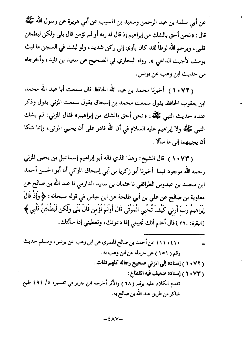 1073 - قَالَ الشَّيْخُ: وَهَذَا الَّذِي قَالَهُ أَبُو إِبْرَاهِيمَ إِسْمَاعِيلُ بْنُ يَحْيَى الْمُزَنِيُّ رَحِمَهُ اللَّهُ مَوْجُودٌ فِيمَا أَخْبَرَنَا أَبُو زَكَرِيَّا بْنُ أَبِي إِسْحَاقَ الْمُزَكِّي، أنا أَبُو الْحَسَنِ أَحْمَدُ بْنُ مُحَمَّدِ بْنِ عَبْدُوسٍ الطَّرَائِفِيُّ، نا عُثْمَانُ بْنُ سَعِيدٍ الدَّارِمِيُّ، نا عَبْدُ اللَّهِ بْنُ صَالِحٍ، عَنْ مُعَاوِيَةَ بْنِ صَالِحٍ، عَنْ عَلِيِّ بْنِ أَبِي طَلْحَةَ، عَنِ ابْنِ عَبَّاسٍ، فِي قَوْلِهِ سُبْحَانَهُ: {وَإِذْ قَالَ إِبْرَاهِيمُ رَبِّ أَرِنِي كَيْفَ تُحْيِي الْمَوْتَى قَالَ: أَوَلَمْ تُؤْمِنْ قَالَ: بَلَى وَلَكِنْ لِيَطْمَئِنَّ قَلْبِي} [البقرة: 260] قَالَ: أَعْلَمُ أَنَّكَ §تُجِيبُنِي إِذَا دَعَوْتُكَ، وَتُعْطِينِي إِذَا سَأَلْتُكَ. -[488]- وَقَالَ أَبُو سُلَيْمَانَ الْخَطَّابِيُّ رَحِمَهُ اللَّهُ: " مَذْهَبُ هَذَا الْحَدِيثِ التَّوَاضُعُ وَالْهَضْمُ مِنَ النَّفْسِ وَلَيْسَ فِي قَوْلِهِ: «نَحْنُ أَحَقُّ بِالشَّكِّ مِنْ إِبْرَاهِيمَ» ، اعْتِرَافٌ بِالشَّكِّ عَلَى نَفْسِهِ، وَلَا عَلَى إِبْرَاهِيمَ صَلَّى اللَّهُ عَلَيْهِمَا، لَكِنْ فِيهِ نَفْيُ الشَّكِّ عَنْ كُلٍّ وَاحِدٍ مِنْهُمَا، يَقُولُ: إِذَا لَمْ أَشُكَّ أَنَا وَلَمْ أَرْتَبْ فِي قُدْرَةِ اللَّهِ عَلَى إِحْيَاءِ الْمَوْتَى، فَإِبْرَاهِيمُ عَلَيْهِ السَّلَامُ أَوْلَى بِأَنْ لَا يَشُكَّ فِيهِ وَلَا يَرْتَابَ، وَفِيهِ الْإِعْلَامُ أَنَّ الْمَسْأَلَةَ مِنْ قِبَلِ إِبْرَاهِيمَ لَمْ تُعْرَضْ مِنْ جِهَةِ الشَّكِّ، لَكِنْ مِنْ قِبَلِ طَلَبِ زِيَادَةِ الْعِلْمِ وَاسْتِفَادَةِ مَعْرِفَةِ كَيْفِيَّةِ الْإِحْيَاءِ، وَالنَّفْسُ تَجِدُ مِنَ الطُّمَأْنِينَةِ بِعِلْمِ الْكَيْفِيَّةِ مَا لَا تَجِدْهُ بِعِلْمِ الْأَنِيَّةِ، وَالْعِلْمُ فِي الْوَجْهَيْنِ حَاصِلٌ، وَالشَّكُّ مَرْفُوعٌ، وَقَدْ قِيلَ: إِنَّمَا طَلَبُ الْإِيمَانِ بِذَلِكَ حِسًّا وَعَيَانًا، لِأَنَّهُ فَوْقَ مَا كَانَ عَلَيْهِ مِنَ الِاسْتِدْلَالِ، وَالْمُسْتَدِلُّ لَا يَزُولُ عَنْهُ الْوَسْوَاسُ وَالْخَوَاطِرُ، وَقَالَ رَسُولُ اللَّهِ صَلَّى اللهُ عَلَيْهِ وَسَلَّمَ: «لَيْسَ الْخَبَرُ كَالْمُعَايَنَةِ» قَالَ: وَحَكَى لَنَا عَنِ ابْنُ الْمُبَارَكِ فِي قَوْلِهِ: {وَلَكِنْ لِيَطْمَئِنَّ قَلْبِي} [البقرة: 260] قَالَ: أَيْ لِيُرَى مَنْ أَدْعُوهُ إِلَيْكَ مَنْزِلَتِي وَمَكَانِي مِنْكَ فَيُجِيبُونِي إِلَى طَاعَتِكَ "