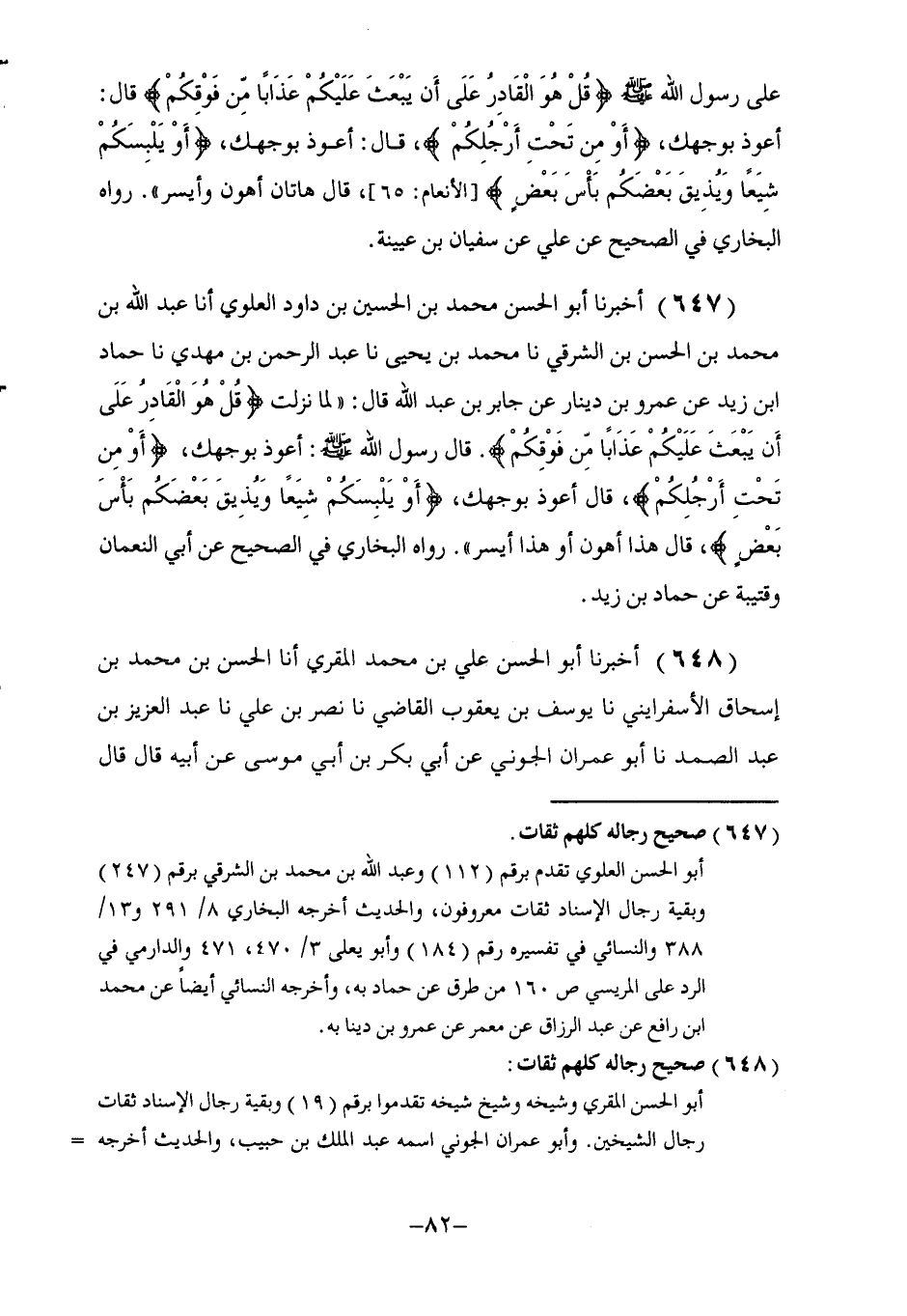 647 - أَخْبَرَنَا أَبُو الْحَسَنِ مُحَمَّدُ بْنُ الْحُسَيْنِ بْنِ دَاوُدَ الْعَلَوِيِّ، أنا عَبْدُ اللَّهِ بْنُ مُحَمَّدِ بْنِ الْحَسَنِ بْنِ الشَّرْقِيِّ، نا مُحَمَّدُ بْنُ يَحْيَى، نا عَبْدُ الرَّحْمَنِ بْنُ مَهْدِيٍّ، نا حَمَّادُ بْنُ زَيْدٍ، عَنْ عَمْرِو بْنِ دِينَارٍ، عَنْ جَابِرِ بْنِ عَبْدِ اللَّهِ، قَالَ: §لَمَّا نَزَلَتْ {قُلْ هُوَ الْقَادِرُ عَلَى أَنْ يَبْعَثَ عَلَيْكُمْ عَذَابًا مِنْ فَوْقِكُمْ} [الأنعام: 65] قَالَ رَسُولُ اللَّهِ صَلَّى اللهُ عَلَيْهِ وَسَلَّمَ: «أَعُوذُ بِوَجْهِكَ» . {أَوْ مِنْ تَحْتِ أَرْجُلِكُمْ} [الأنعام: 65] . قَالَ: «أَعُوذُ بِوَجْهِكَ» . {أَوْ يَلْبِسَكُمْ شِيَعًا وَيُذِيقَ بَعْضَكُمْ بَأْسَ بَعْضٍ} [الأنعام: 65] . قَالَ: «هَذَا أَهْوَنُ - أَوْ هَذَا أَيْسَرُ -» . رَوَاهُ الْبُخَارِيُّ فِي الصَّحِيحِ عَنْ أَبِي النُّعْمَانِ وَقُتَيْبَةَ، عَنْ حَمَّادِ بْنِ زَيْدٍ
