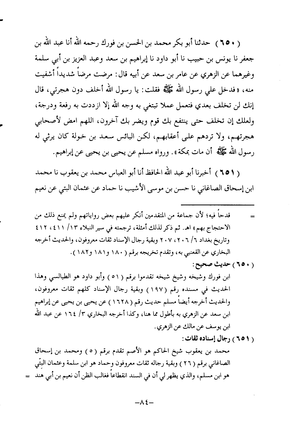 650 - حَدَّثَنَا أَبُو بَكْرٍ مُحَمَّدُ بْنُ الْحَسَنِ بْنِ فُورَكٍ رَحِمَهُ اللَّهُ، أنا عَبْدُ اللَّهِ بْنُ جَعْفَرٍ، نا يُونُسُ بْنُ حَبِيبٍ، نا أَبُو دَاوُدَ، نا إِبْرَاهِيمُ بْنُ سَعْدٍ، وَعَبْدُ الْعَزِيزِ بْنُ أَبِي سَلَمَةَ وَغَيْرُهُمَا، عَنِ الزُّهْرِيِّ، عَنْ عَامِرِ بْنِ سَعْدٍ، عَنْ أَبِيهِ، قَالَ: مَرِضْتُ مَرَضًا شَدِيدًا أُشْفِيتُ مِنْهُ، فَدَخَلَ عَلَيَّ رَسُولُ اللَّهِ صَلَّى اللهُ عَلَيْهِ وَسَلَّمَ فَقُلْتُ: يَا رَسُولَ اللَّهِ، أُخَلَّفُ دُونَ هِجْرَتِي. قَالَ: «إِنَّكَ لَنْ تُخَلَّفَ بَعْدِي فَتَعْمَلَ عَمَلًا تَبْتَغِي بِهِ وَجْهَ اللَّهِ إِلَّا ازْدَدْتَ بِهِ رِفْعَةً وَدَرَجَةً، وَلَعَلَّكَ إِنْ تُخَلَّفَ حَتَّى يَنْتَفِعَ بِكَ قَوْمٌ وَيُضَرَّ بِكَ آخَرُونَ، §اللَّهُمَّ أمْضِ لِأَصْحَابِي هِجْرَتَهُمْ، وَلَا تَرُدَّهُمْ عَلَى أَعْقَابِهِمْ، لَكِنِ الْبَائِسُ سَعْدُ بْنُ خَوْلَةَ كَانَ يَرْثِي لَهُ رَسُولُ اللَّهِ صَلَّى اللهُ عَلَيْهِ وَسَلَّمَ أَنْ مَاتَ بِمَكَّةَ» . وَرَوَاهُ مُسْلِمٌ عَنْ يَحْيَى بْنِ يَحْيَى عَنْ إِبْرَاهِيمَ
