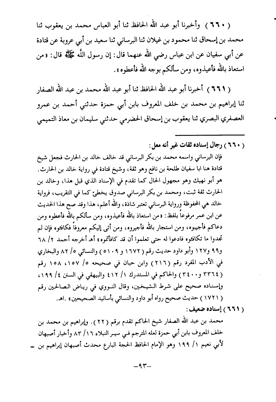 661 - أَخْبَرَنَا أَبُو عَبْدِ اللَّهِ الْحَافِظُ، ثنا أَبُو عَبْدِ اللَّهِ مُحَمَّدُ بْنُ عَبْدِ اللَّهِ الصَّفَّارُ، ثنا إِبْرَاهِيمُ بْنُ مُحَمَّدِ بْنِ خَلَفٍ الْمَعْرُوفُ بِابْنِ أَبِي حَمْزَةَ، حَدَّثَنِي أَحْمَدُ بْنُ عَمْرٍو الْعُصْفُرِيُّ الْبَصْرِيُّ، ثنا يَعْقُوبُ بْنُ إِسْحَاقَ الْحَضْرَمِيُّ، حَدَّثَنِي سُلَيْمَانُ بْنُ مُعَاذٍ التَّمِيمِيُّ، -[94]- عَنْ مُحَمَّدِ بْنِ الْمُنْكَدِرِ، عَنْ جَابِرِ بْنِ عَبْدِ اللَّهِ، رَضِيَ اللَّهُ عَنْهُمَا قَالَ: قَالَ النَّبِيُّ صَلَّى اللهُ عَلَيْهِ وَسَلَّمَ: §«لَا يَنْبَغِي لِأَحَدٍ أَنْ يَسْأَلَ بِوَجْهِ اللَّهِ شَيْئًا إِلَّا الْجَنَّةَ» . أَخْرَجَهُ أَبُو دَاوُدَ فِي كِتَابِ السُّنَنِ عَنْ أَبِي الْعَبَّاسِ الْعُصْفُرِيِّ