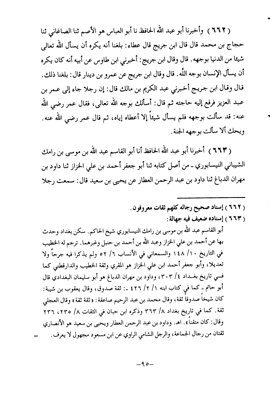 662 - وَأَخْبَرَنَا أَبُو عَبْدِ اللَّهِ الْحَافِظُ، نا أَبُو الْعَبَّاسِ هُوَ الْأَصَمُّ، ثنا الصَّاغَانِيُّ، ثنا حَجَّاجُ بْنُ مُحَمَّدٍ، قَالَ: قَالَ ابْنُ جُرَيْجٍ: قَالَ عَطَاءٌ: بَلَغَنَا أَنَّهُ §يُكْرَهُ أَنْ يُسْأَلَ اللَّهُ تَعَالَى شَيْئًا مِنَ الدُّنْيَا بِوَجْهِهِ