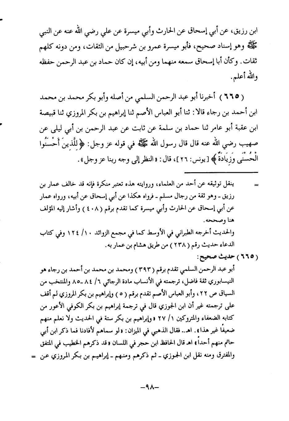 665 - أَخْبَرَنَا أَبُو عَبْدِ الرَّحْمَنِ السُّلَمِيُّ، مِنْ أَصْلِهِ وَأَبُو بَكْرٍ مُحَمَّدُ بْنُ مُحَمَّدِ بْنِ أَحْمَدَ بْنِ رَجَاءٍ قَالَا: ثنا أَبُو الْعَبَّاسِ الْأَصَمُّ، ثنا إِبْرَاهِيمُ بْنُ بَكْرٍ الْمَرْوَزِيُّ، ثنا قَبِيصَةُ بْنُ عُقْبَةَ أَبُو عَامِرٍ، ثنا حَمَّادُ بْنُ سَلَمَةَ، عَنْ ثَابِتٍ، عَنْ عَبْدِ الرَّحْمَنِ بْنِ أَبِي لَيْلَى، عَنْ صُهَيْبٍ، رَضِيَ اللَّهُ عَنْهُ قَالَ: قَالَ رَسُولُ اللَّهِ صَلَّى اللهُ عَلَيْهِ وَسَلَّمَ فِي قَوْلِهِ عَزَّ وَجَلَّ: {§لِلَّذِينَ أَحْسَنُوا الْحُسْنَى وَزِيَادَةٌ} [يونس: 26] ، قَالَ:: «النَّظَرُ إِلَى وَجْهِ رَبِّنَا عَزَّ وَجَلَّ»