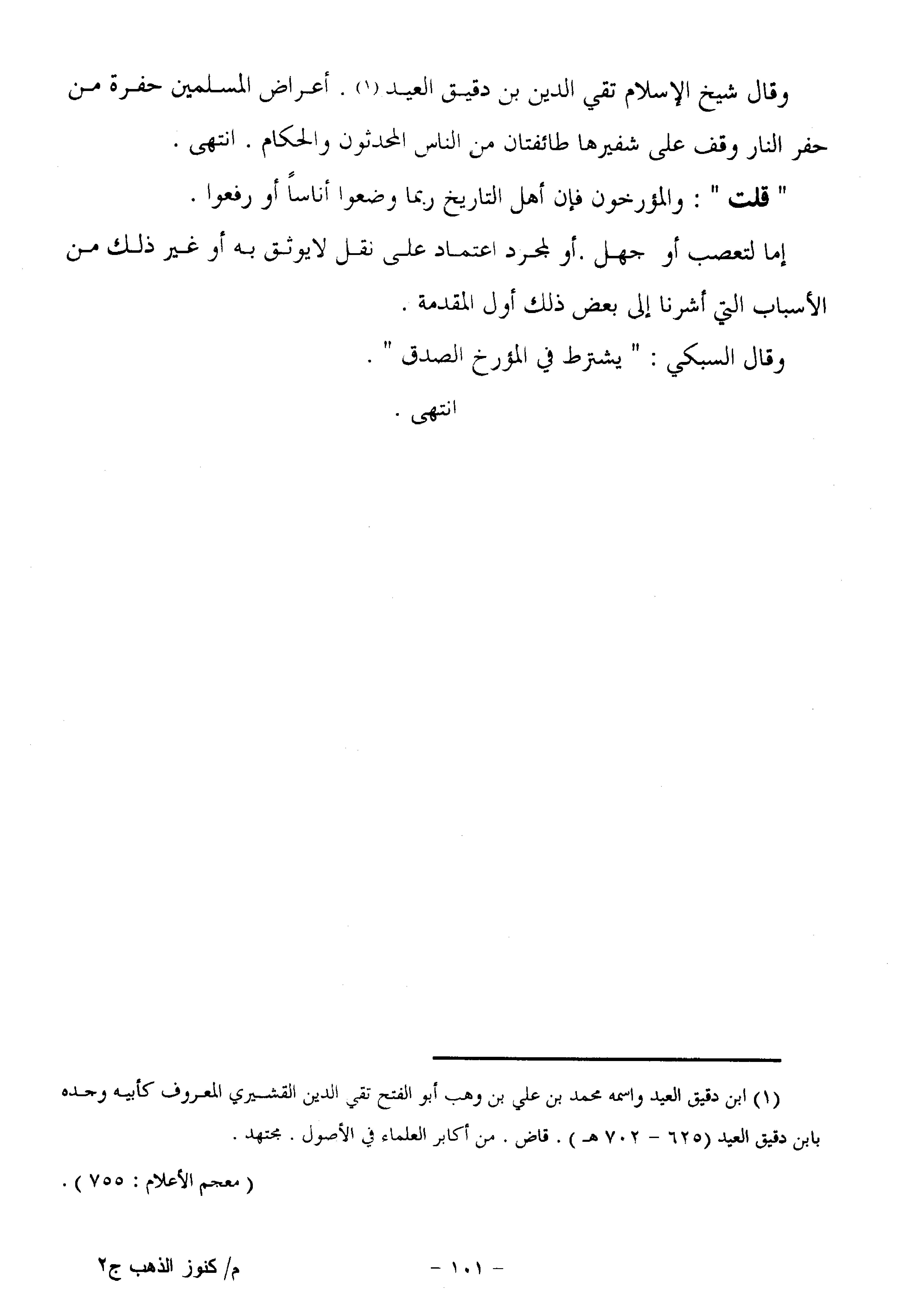وقال شيخ الإسلام تقي الدين بن دقيق العيد «1» . أعراض المسلمين حفرة من حفر النار وقف على شفيرها طائفتان من الناس المحدثون والحكام. انتهى.