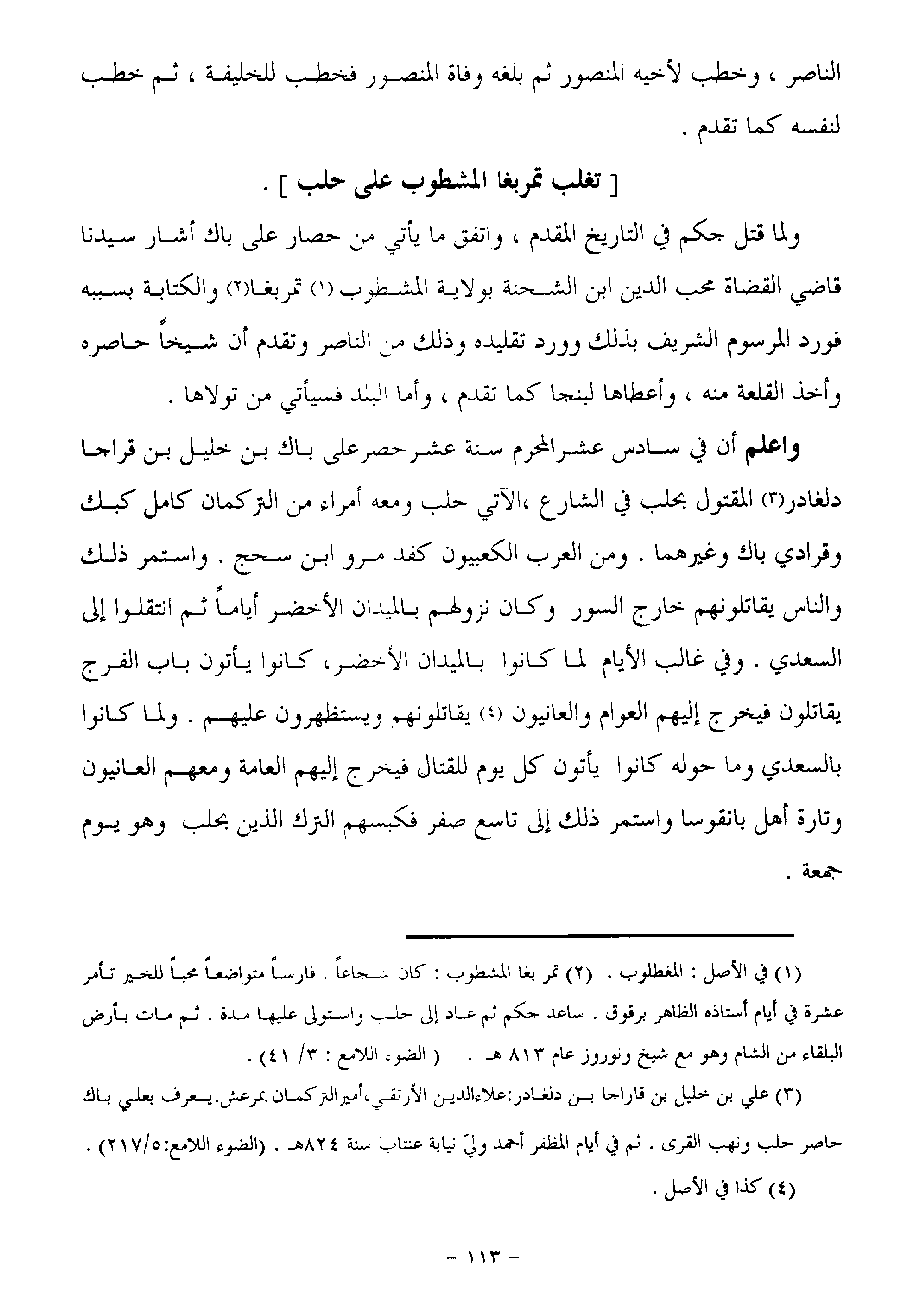 واعلم أن في سادس عشر المحرم سنة عشر حصر على باك بن خليل بن قراجا دلغادر «3» المقتول بحلب في الشارع، الآتي حلب ومعه أمراء من التركمان كامل كبك وقرادي باك وغيرهما. ومن العرب الكعبيون كفد مرو ابن سحج. واستمر ذلك والناس يقاتلونهم خارج السور وكان نزولهم بالميدان الأخضر أياما ثم انتقلوا إلى السعدي. وفي غالب الأيام لما كانوا بالميدان الأخضر، كانوا يأتون باب الفرج يقاتلون فيخرج إليهم العوام والعانيون «4» يقاتلونهم ويستظهرون عليهم. ولما كانوا بالسعدي وما حوله كانوا يأتون كل يوم للقتال فيخرج إليهم العامة ومعهم العانيون وتارة أهل بانقوسا واستمر ذلك إلى تاسع صفر فكبسهم الترك الذين بحلب وهو يوم جمعة.
