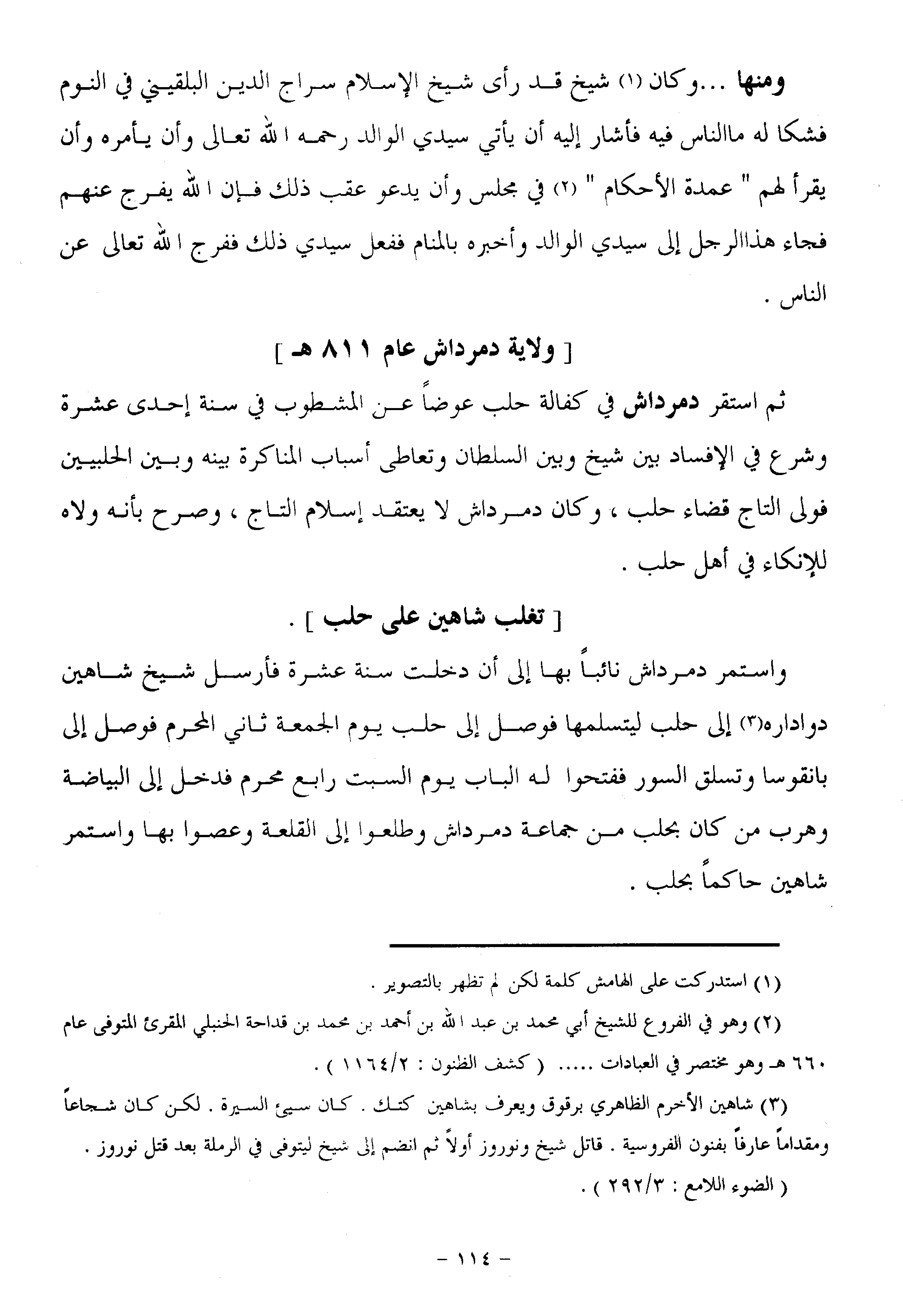 واستمر دمرداش نائبا بها إلى أن دخلت سنة عشرة فأرسل شيخ شاهين دواداره «3» إلى حلب ليتسلمها فوصل إلى حلب يوم الجمعة ثاني المحرم فوصل إلى بانقوسا وتسلق السور ففتحوا له الباب يوم السبت رابع محرم فدخل إلى البياضة وهرب من كان بحلب من جماعة دمرداش وطلعوا إلى القلعة وعصوا بها واستمر شاهين حاكما بحلب.