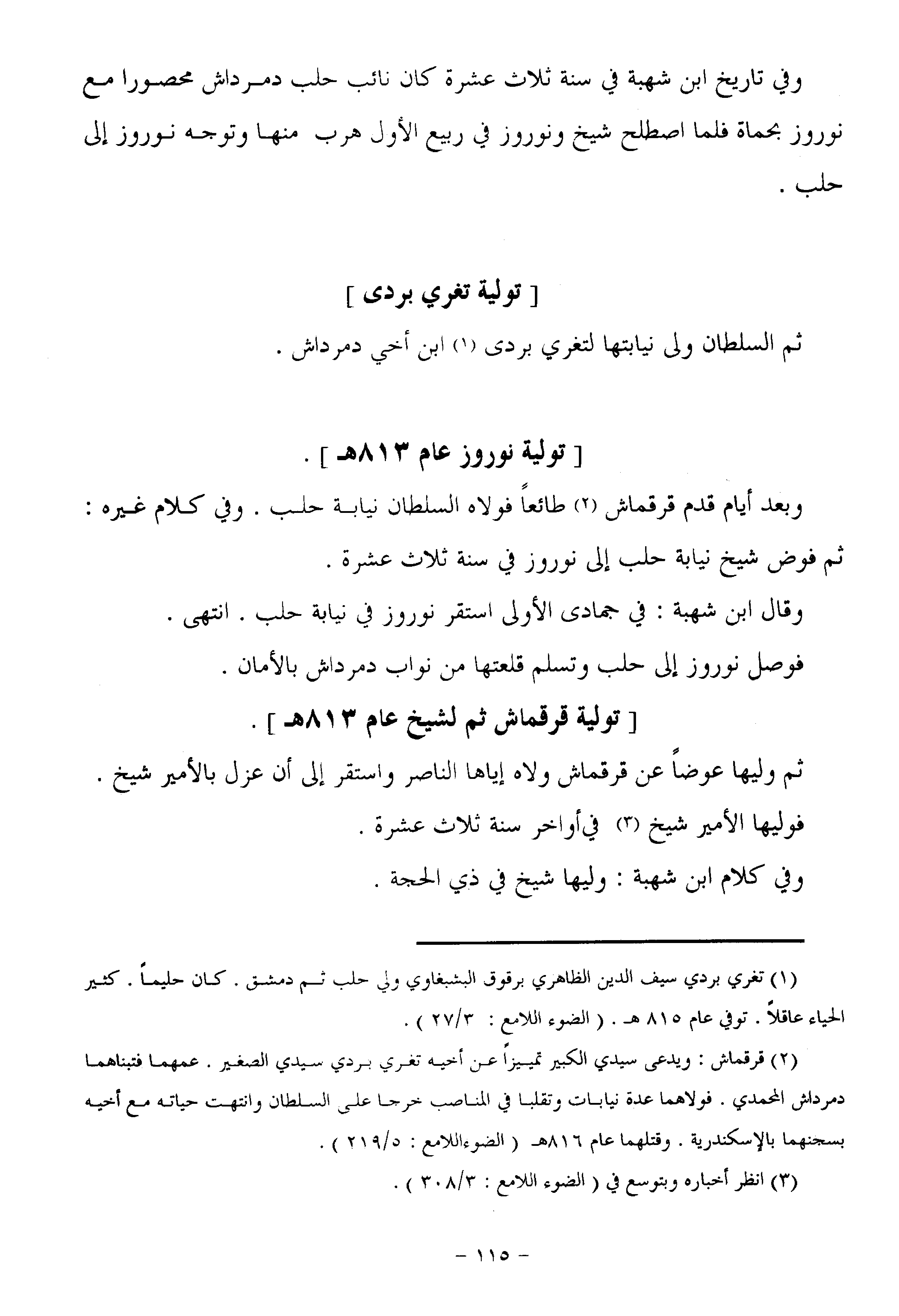 وفي تاريخ ابن شهبة في سنة ثلاث عشرة كان نائب حلب دمرداش محصورا مع نوروز بحماة فلما اصطلح شيخ ونوروز في ربيع الأول هرب منها وتوجه نوروز إلى حلب.