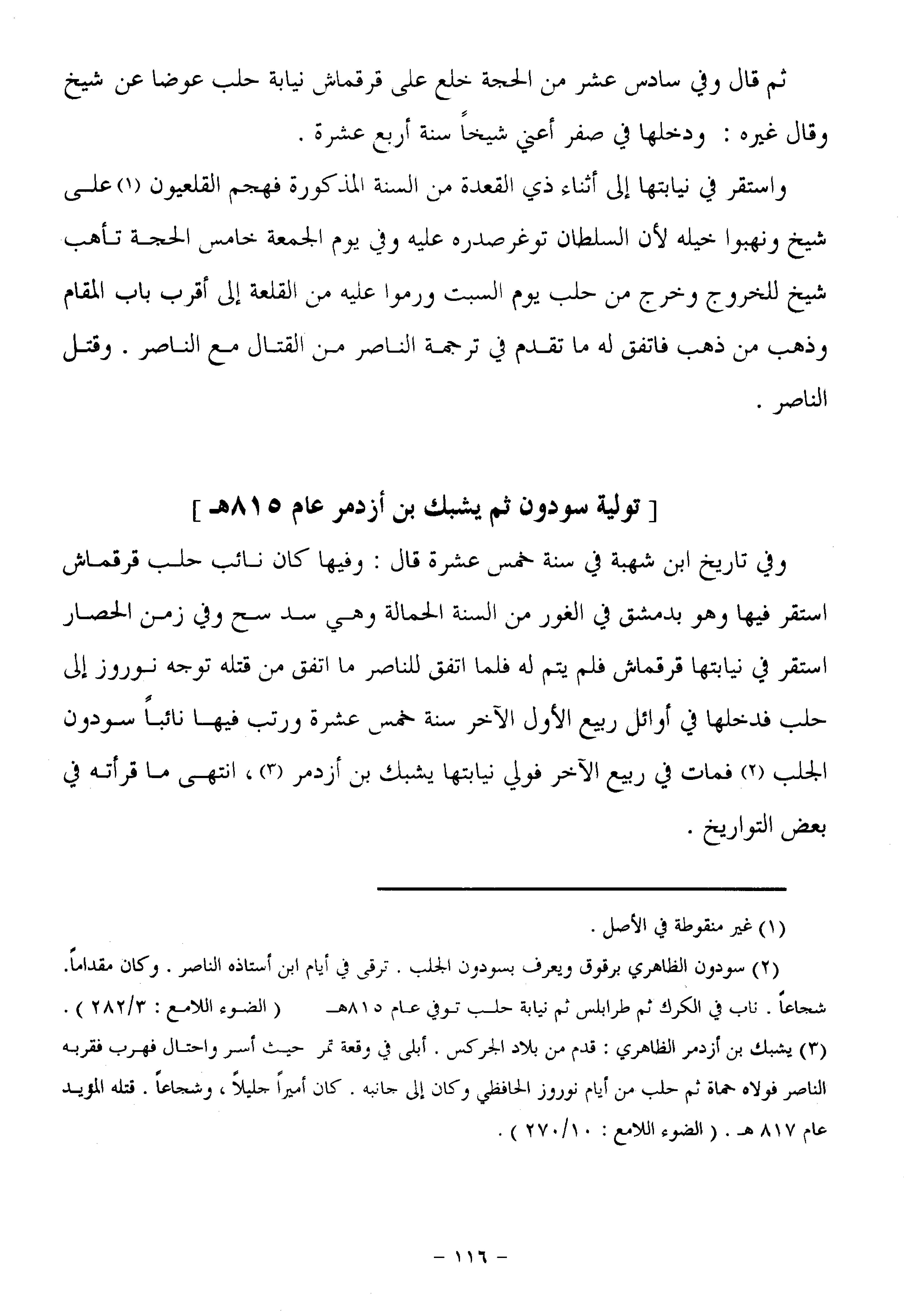 ثم قال وفي سادس عشر من الحجة خلع على قرقماش نيابة حلب عوضا عن شيخ وقال غيره: ودخلها في صفر أعني شيخا سنة أربع عشرة.
