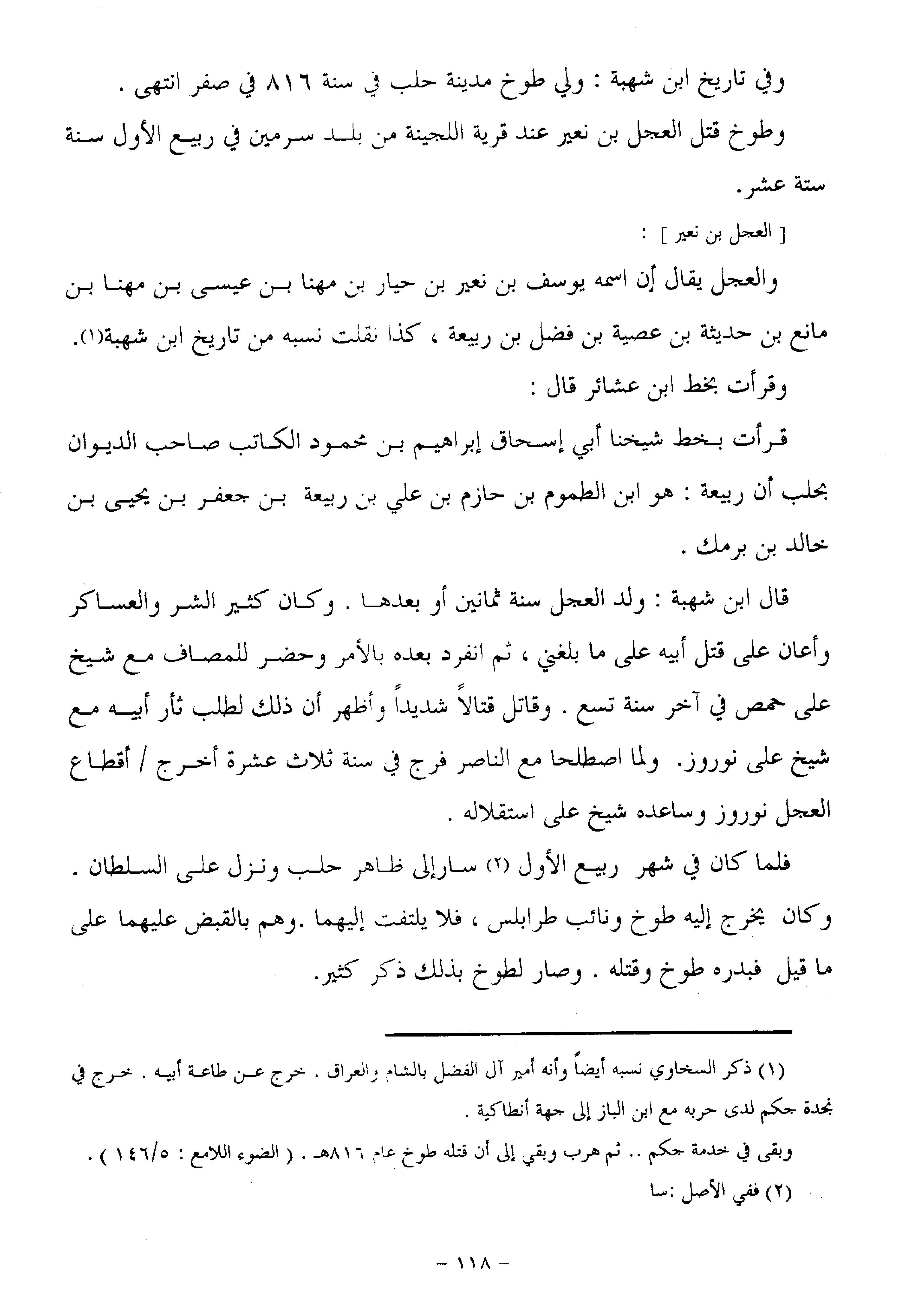 قال ابن شهبة: ولد العجل سنة ثمانين أو بعدها. وكان كثير الشر والعساكر وأعان على قتل أبيه على ما بلغني، ثم انفرد بعده بالأمر وحضر للمصاف مع شيخ على حمص في آخر سنة تسع. وقاتل قتالا شديدا وأظهر أن ذلك لطلب ثأر أبيه مع شيخ على نوروز. ولما اصطلحا مع الناصر فرج في سنة ثلاث عشرة أخرج/ أقطاع العجل نوروز وساعده شيخ على استقلاله.