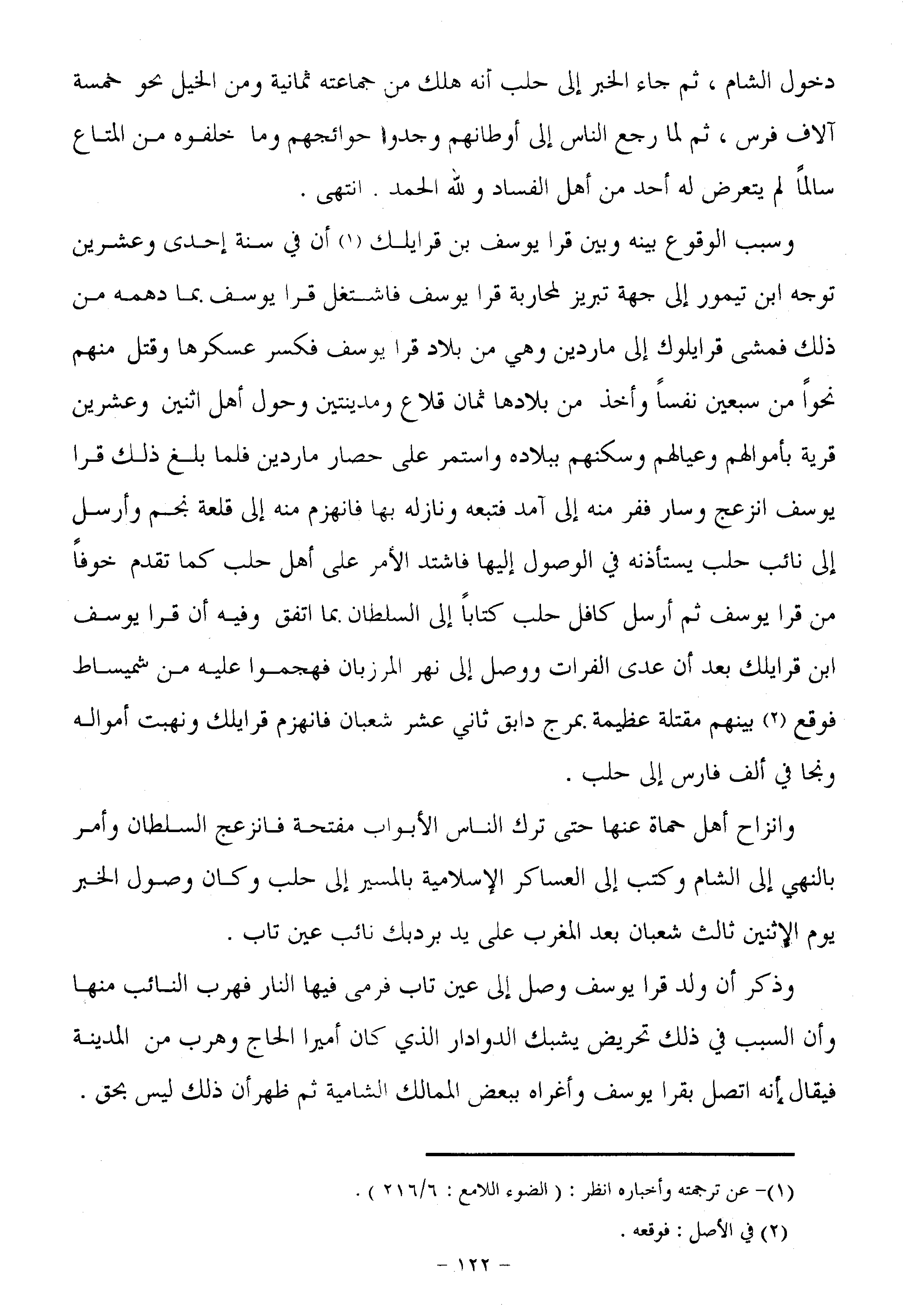 وسبب الوقوع بينه وبين قرا يوسف بن قرايلك «1» أن في سنة إحدى وعشرين توجه ابن تيمور إلى جهة تبريز لمحاربة قرا يوسف فاشتغل قرا يوسف بما دهمه من ذلك فمشى قرايلوك إلى ماردين وهي من بلاد قرا يوسف فكسر عسكرها وقتل منهم نحوا من سبعين نفسا وأخذ من بلادها ثمان قلاع ومدينتين وحول أهل اثنين وعشرين قرية بأموالهم وعيالهم وسكنهم ببلاده واستمر على حصار ماردين فلما بلغ ذلك قرا يوسف انزعج وسار ففر منه إلى آمد فتبعه ونازله بها فانهزم منه إلى قلعة نجم وأرسل إلى نائب حلب يستأذنه في الوصول إليها فاشتد الأمر على أهل حلب كما تقدم خوفا من قرا يوسف ثم أرسل كافل حلب كتابا إلى السلطان بما اتفق وفيه أن قرا يوسف ابن قرايلك بعد أن عدى الفرات ووصل إلى نهر المرزبان فهجموا عليه من شميساط فوقع «2» بينهم مقتلة عظيمة بمرج دابق ثاني عشر شعبان فانهزم قرايلك ونهبت أمواله ونجا في ألف فارس إلى حلب.
