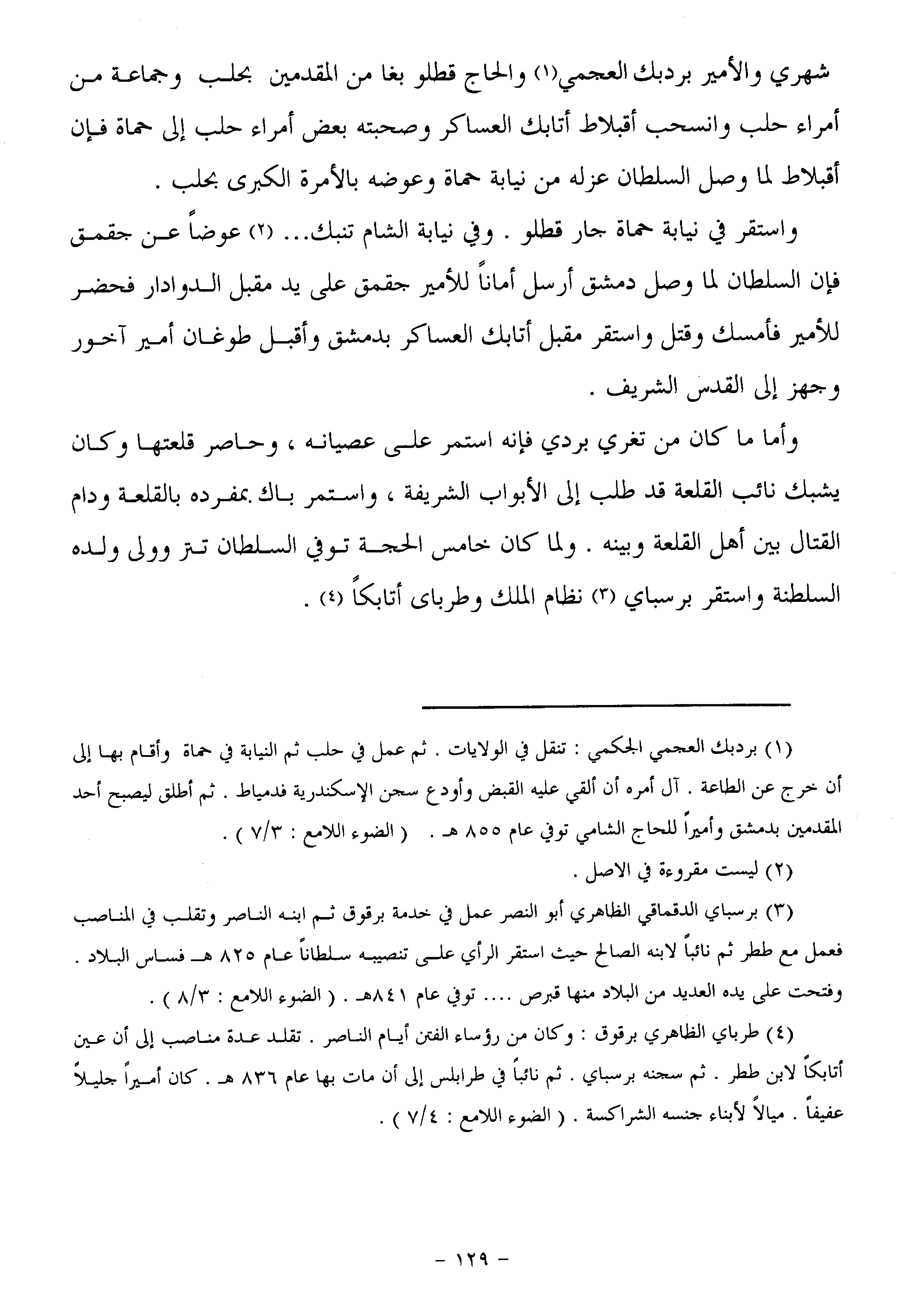 وأما ما كان من تغري بردي فإنه استمر على عصيانه، وحاصر قلعتها وكان يشبك نائب القلعة قد طلب إلى الأبواب الشريفة، واستمر باك بمفرده بالقلعة ودام القتال بين أهل القلعة وبينه. ولما كان خامس الحجة توفي السلطان تتر وولى ولده السلطنة واستقر برسباي «3» نظام الملك وطرباى أتابكا «4» .