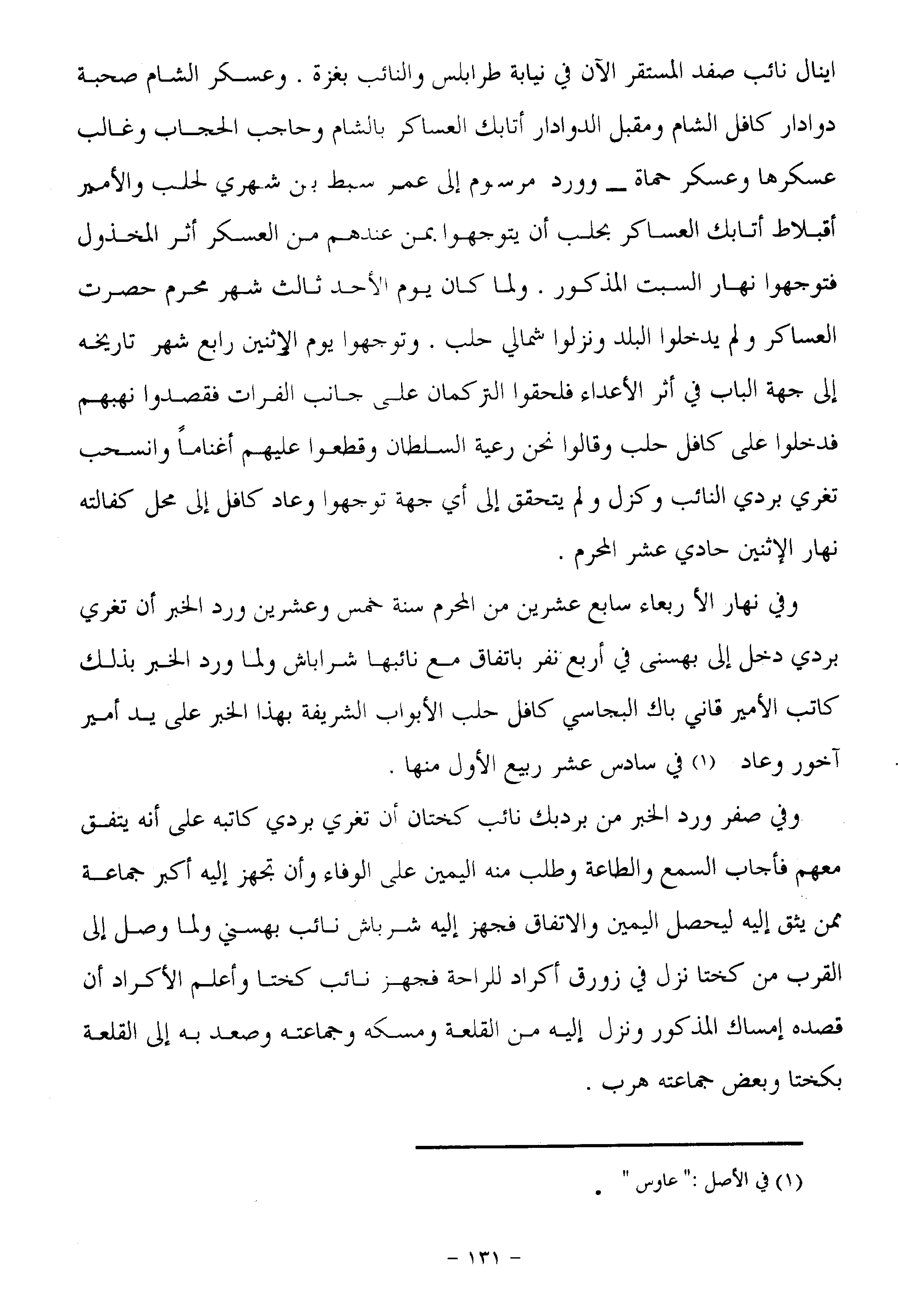 اينال نائب صفد المستقر الآن في نيابة طرابلس والنائب بغزة. وعسكر الشام صحبة دوادار كافل الشام ومقبل الدوادار أتابك العساكر بالشام وحاجب الحجاب وغالب عسكرها وعسكر حماة- وورد مرسوم إلى عمر سبط بن شهري لحلب والأمور أقبلاط أتابك العساكر بحلب أن يتوجهوا بمن عندهم من العسكر أثر المخذول فتوجهوا نهار السبت المذكور. ولما كان يوم الأحد ثالث شهر محرم حصرت العساكر ولم يدخلوا البلد ونزلوا شمالي حلب. وتوجهوا يوم الاثنين رابع شهر تاريخه إلى جهة الباب في أثر الأعداء فلحقوا التركمان على جانب الفرات فقصدوا نهبهم فدخلوا على كافل حلب وقالوا نحن رعية السلطان وقطعوا عليهم أغناما وانسحب تغري بردي النائب وكزل ولم يتحقق إلى أي جهة توجهوا وعاد كافل إلى محل كفالته نهار الاثنين حادي عشر المحرم.
