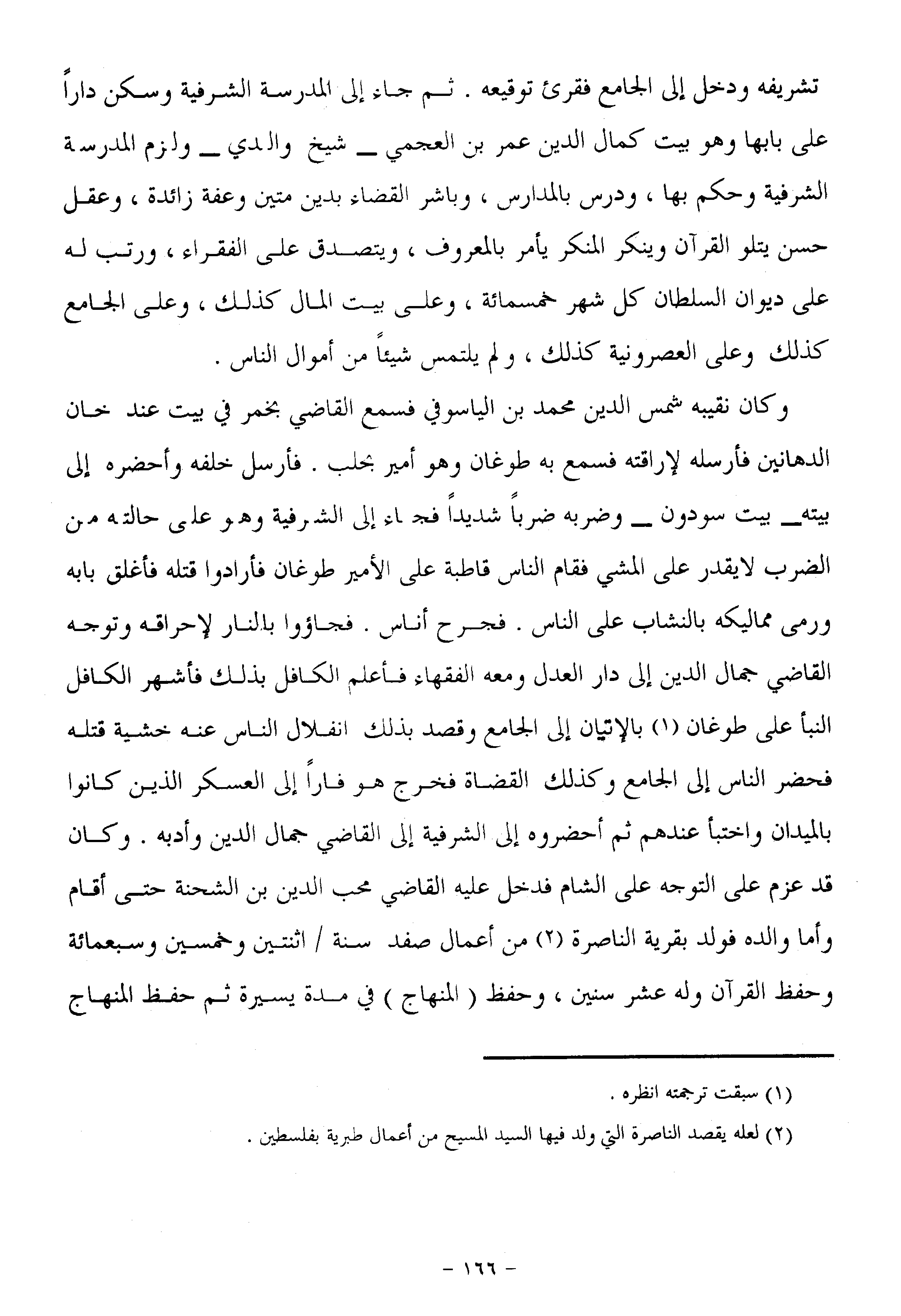 وكان نقيبه شمس الدين محمد بن الياسوفي فسمع القاضي بخمر في بيت عند خان الدهانين فأرسله لإراقته فسمع به طوغان وهو أمير بحلب. فأرسل خلفه وأحضره إلى بيته- بيت سودون- وضربه ضربا شديدا فجاء إلى الشرفية وهو على حالته من الضرب لا يقدر على المشي فقام الناس قاطبة على الأمير طوغان فأرادوا قتله فأغلق بابه ورمى مماليكه بالنشاب على الناس. فجرح أناس. فجاؤوا بالنار لإحراقه وتوجه القاضي جمال الدين إلى دار العدل ومعه الفقهاء فأعلم الكافل بذلك فأشهر الكافل النبأ على طوغان «1» بالإتيان إلى الجامع وقصد بذلك انفلال الناس عنه خشية قتله فحضر الناس إلى الجامع وكذلك القضاة فخرج هو فارا إلى العسكر الذين كانوا بالميدان واختبأ عندهم ثم أحضروه إلى الشرفية إلى القاضي جمال الدين وأدبه. وكان قد عزم على التوجه على الشام فدخل عليه القاضي محب الدين بن الشحنة حتى أقام وأما والده فولد بقرية الناصرة «2» من أعمال صفد سنة/ اثنتين وخمسين وسبعمائة وحفظ القرآن وله عشر سنين، وحفظ (المنهاج) في مدة يسيرة ثم حفظ المنهاج
