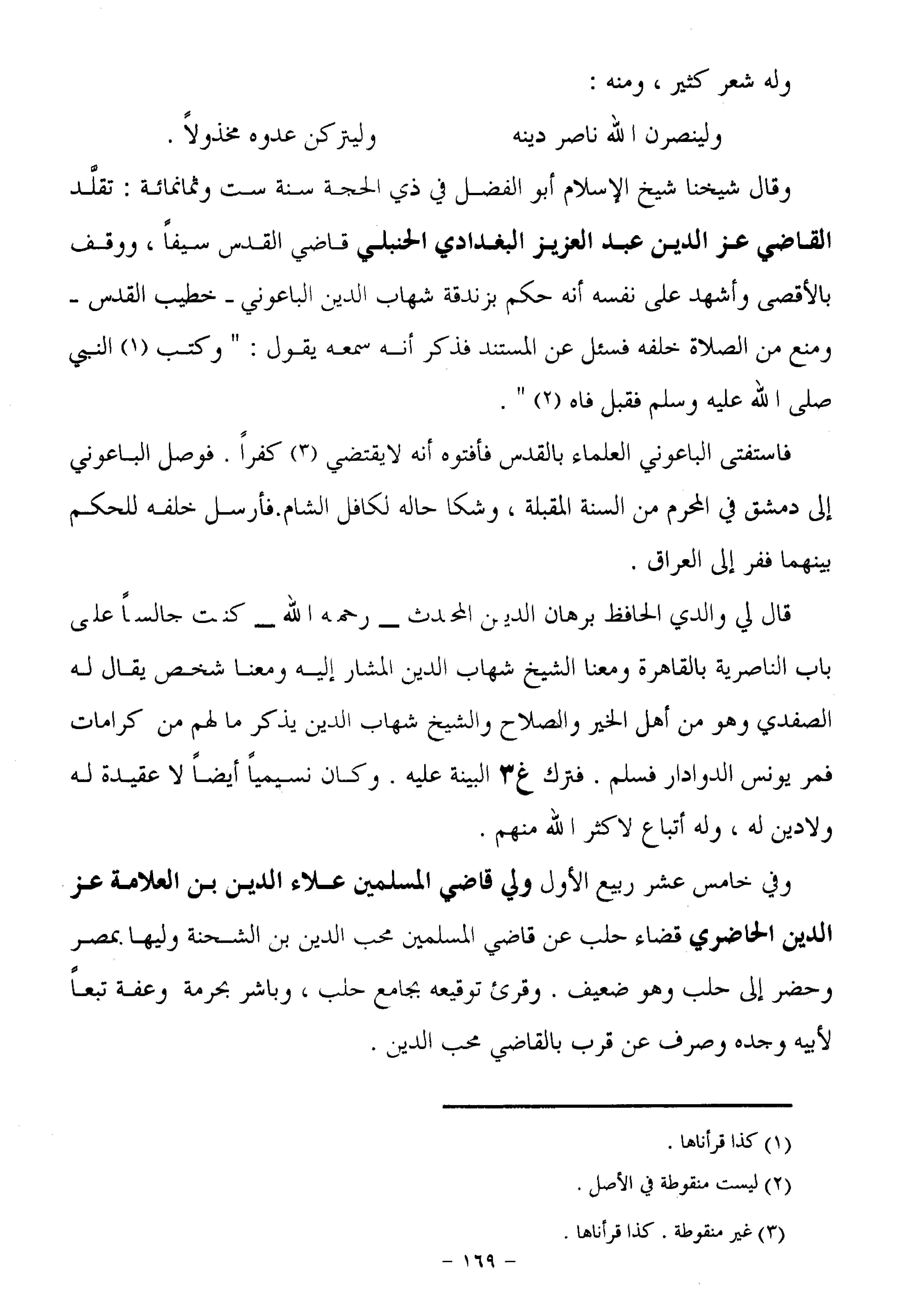 وقال شيخنا شيخ الإسلام أبو الفضل في ذي الحجة سنة ست وثمانمائة: تقلّد القاضي عز الدين عبد العزيز البغدادي الحنبلي قاضي القدس سيفا، ووقف بالأقصى وأشهد على نفسه أنه حكم بزندقة شهاب الدين الباعوني- خطيب القدس- ومنع من الصلاة خلفه فسئل عن المستند فذكر أنه سمعه يقول:" وكتب «1» النبي صلى الله عليه وسلم فقبل فاه «2» ".