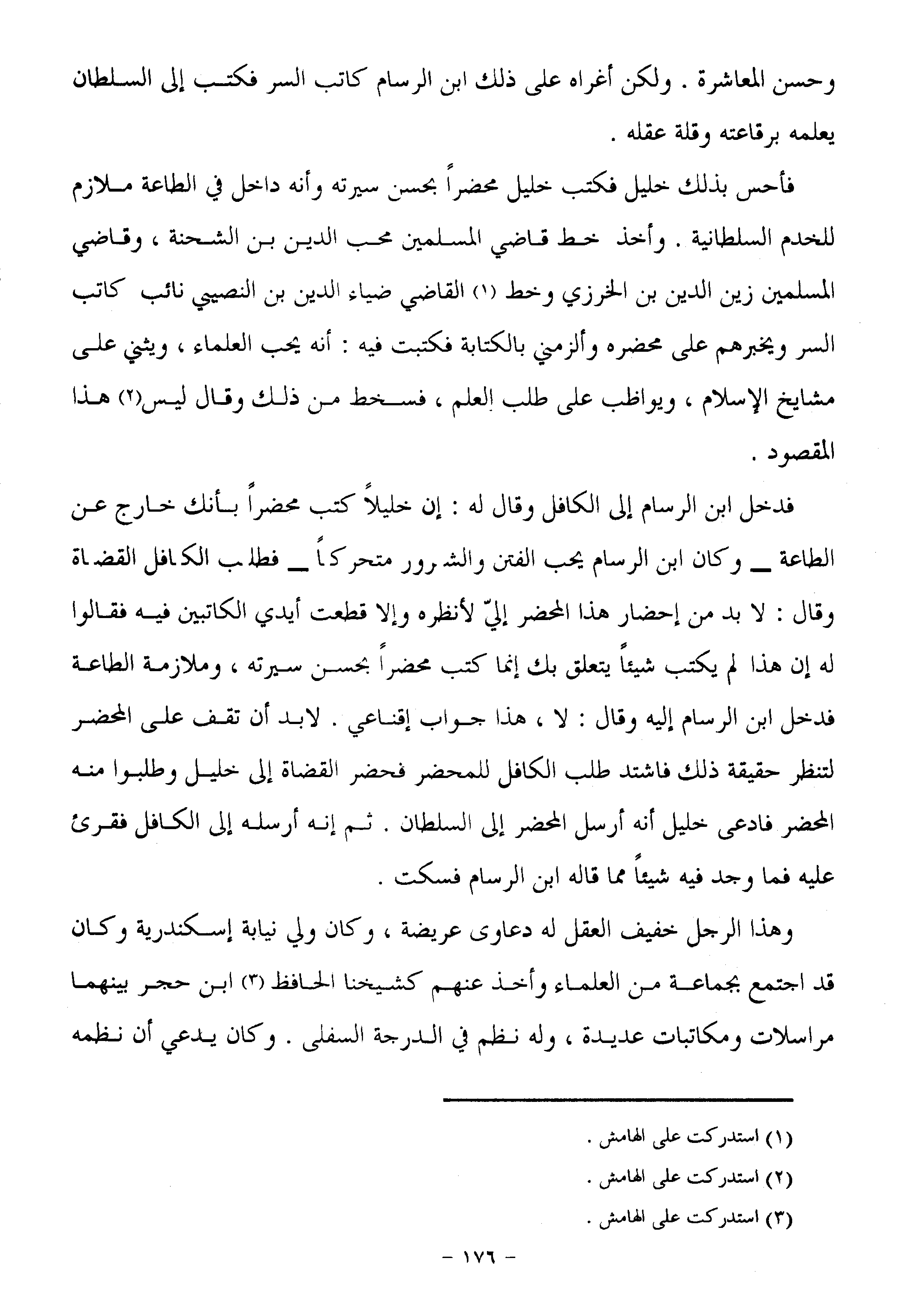 فدخل ابن الرسام إلى الكافل وقال له: إن خليلا كتب محضرا بأنك خارج عن الطاعة- وكان ابن الرسام يحب الفتن والشرور متحركا- فطلب الكافل القضاة وقال: لا بد من إحضار هذا المحضر إليّ لأنظره وإلا قطعت أيدي الكاتبين فيه فقالوا له إن هذا لم يكتب شيئا يتعلق بك إنما كتب محضرا بحسن سيرته، وملازمة الطاعة فدخل ابن الرسام إليه وقال: لا، هذا جواب إقناعي. لابد أن تقف على المحضر لتنظر حقيقة ذلك فاشتد طلب الكافل للمحضر فحضر القضاة إلى خليل وطلبوا منه المحضر فادعى خليل أنه أرسل المحضر إلى السلطان. ثم إنه أرسله إلى الكافل فقرئ عليه فما وجد فيه شيئا مما قاله ابن الرسام فسكت.