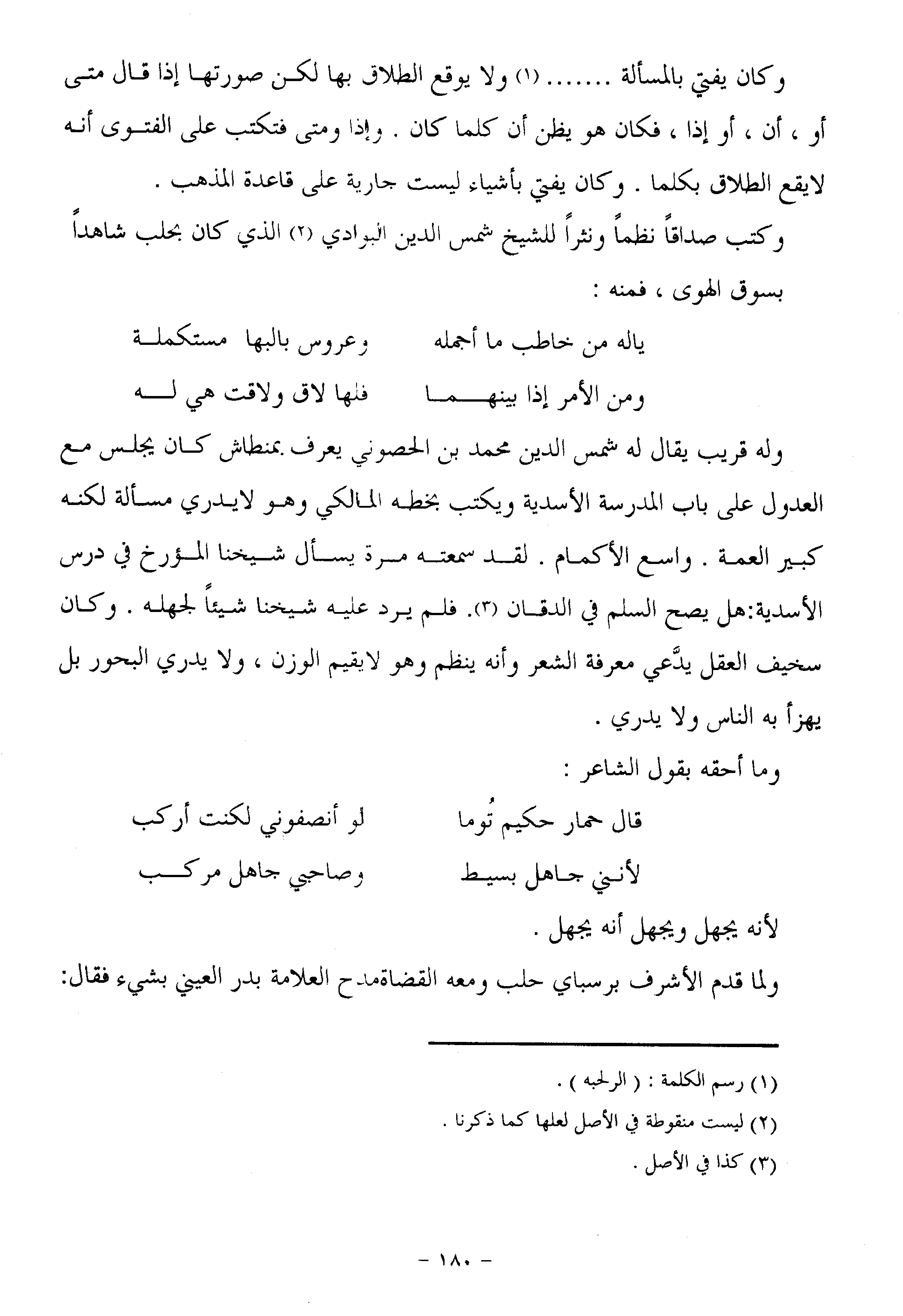 وله قريب يقال له شمس الدين محمد بن الحصوني يعرف بمنطاش كان يجلس مع العدول على باب المدرسة الأسدية ويكتب بخطه المالكي وهو لا يدري مسألة لكنه كبير العمة. واسع الأكمام. لقد سمعته مرة يسأل شيخنا المؤرخ في درس الأسدية: هل يصح السلم في الدقان «3» . فلم يرد عليه شيخنا شيئا لجهله. وكان سخيف العقل يدّعي معرفة الشعر وأنه ينظم وهو لا يقيم الوزن، ولا يدري البحور بل يهزأ به الناس ولا يدري.