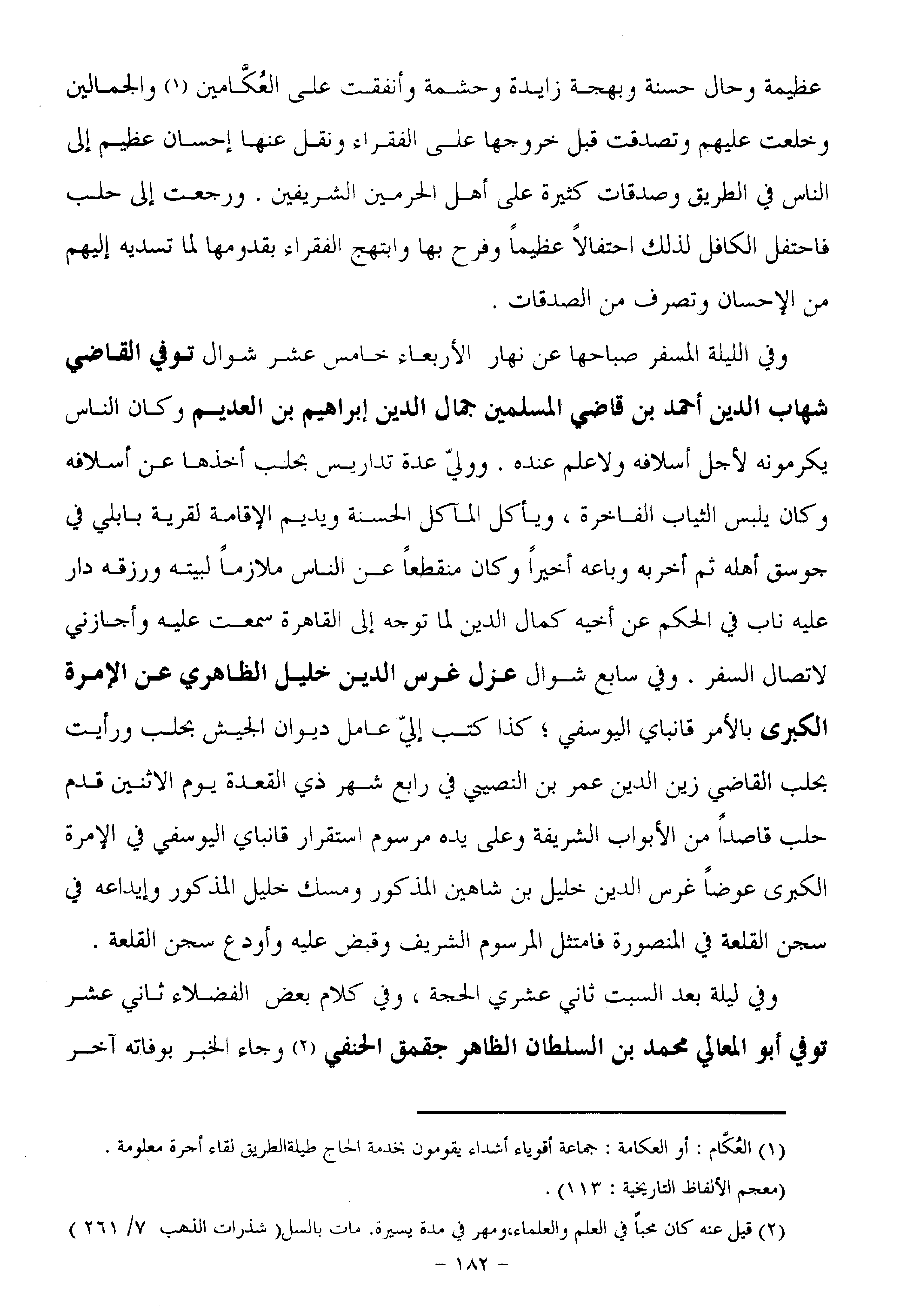 وفي الليلة المسفر صباحها عن نهار الأربعاء خامس عشر شوال توفي القاضي شهاب الدين أحمد بن قاضي المسلمين جمال الدين إبراهيم بن العديم وكان الناس يكرمونه لأجل أسلافه ولا علم عنده. ووليّ عدة تداريس بحلب أخذها عن أسلافه وكان يلبس الثياب الفاخرة، ويأكل المآكل الحسنة ويديم الإقامة لقرية بابلي في جوسق أهله ثم أخربه وباعه أخيرا وكان منقطعا عن الناس ملازما لبيته ورزقه دار عليه ناب في الحكم عن أخيه كمال الدين لما توجه إلى القاهرة سمعت عليه وأجازني لاتصال السفر. وفي سابع شوال عزل غرس الدين خليل الظاهري عن الإمرة الكبرى بالأمر قانباي اليوسفي؛ كذا كتب إليّ عامل ديوان الجيش بحلب ورأيت بحلب القاضي زين الدين عمر بن النصيي في رابع شهر ذي القعدة يوم الاثنين قدم حلب قاصدا من الأبواب الشريفة وعلى يده مرسوم استقرار قانباي اليوسفي في الإمرة الكبرى عوضا غرس الدين خليل بن شاهين المذكور ومسك خليل المذكور وإيداعه في سجن القلعة في المنصورة فامتثل المرسوم الشريف وقبض عليه وأودع سجن القلعة.