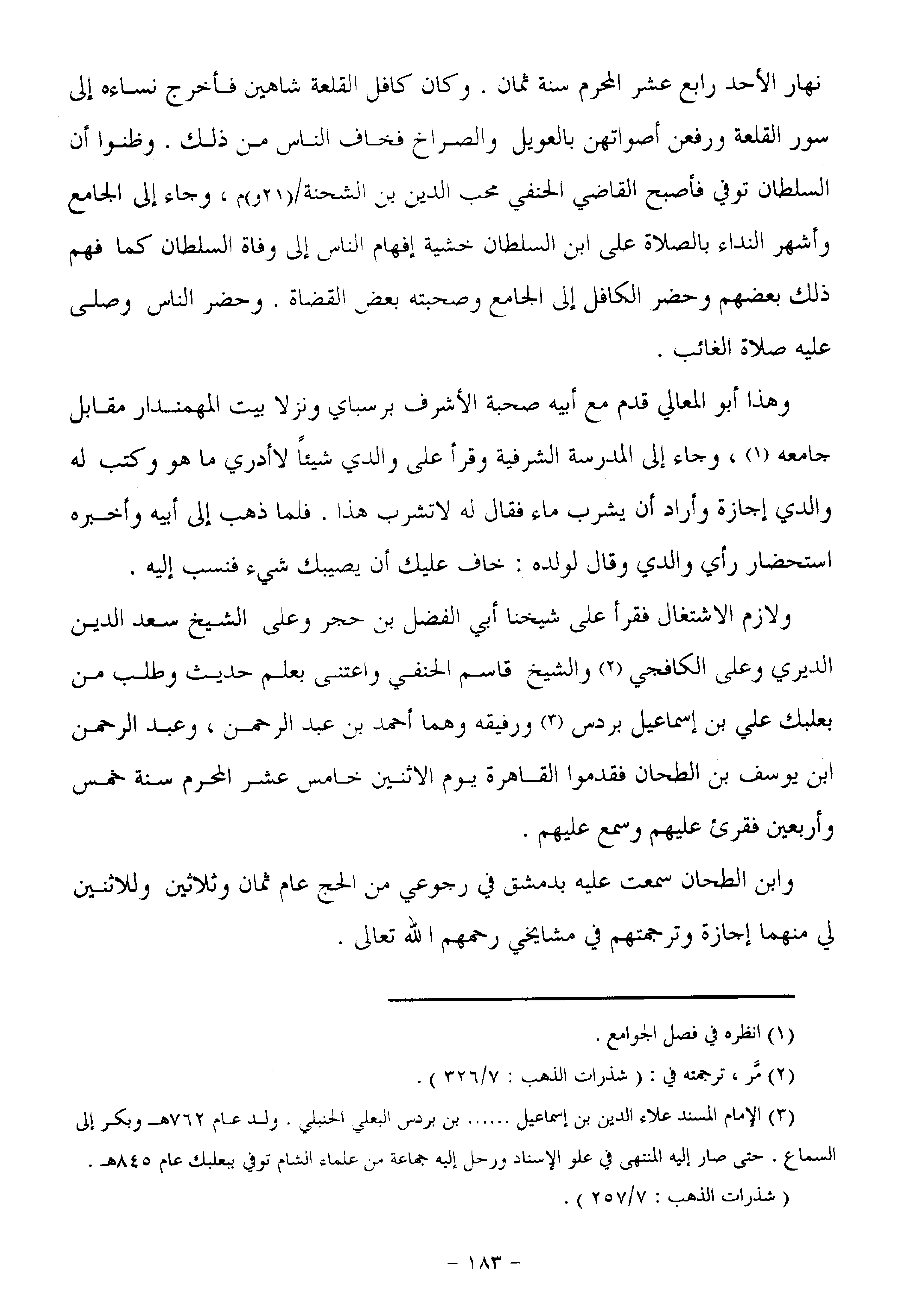 ولازم الاشتغال فقرأ على شيخنا أبي الفضل بن حجر وعلى الشيخ سعد الدين الديري وعلى الكافجي «2» والشيخ قاسم الحنفي واعتنى بعلم حديث وطلب من بعلبك علي بن إسماعيل بردس «3» ورفيقه وهما أحمد بن عبد الرحمن، وعبد الرحمن ابن يوسف بن الطحان فقدموا القاهرة يوم الاثنين خامس عشر المحرم سنة خمس وأربعين فقرئ عليهم وسمع عليهم.