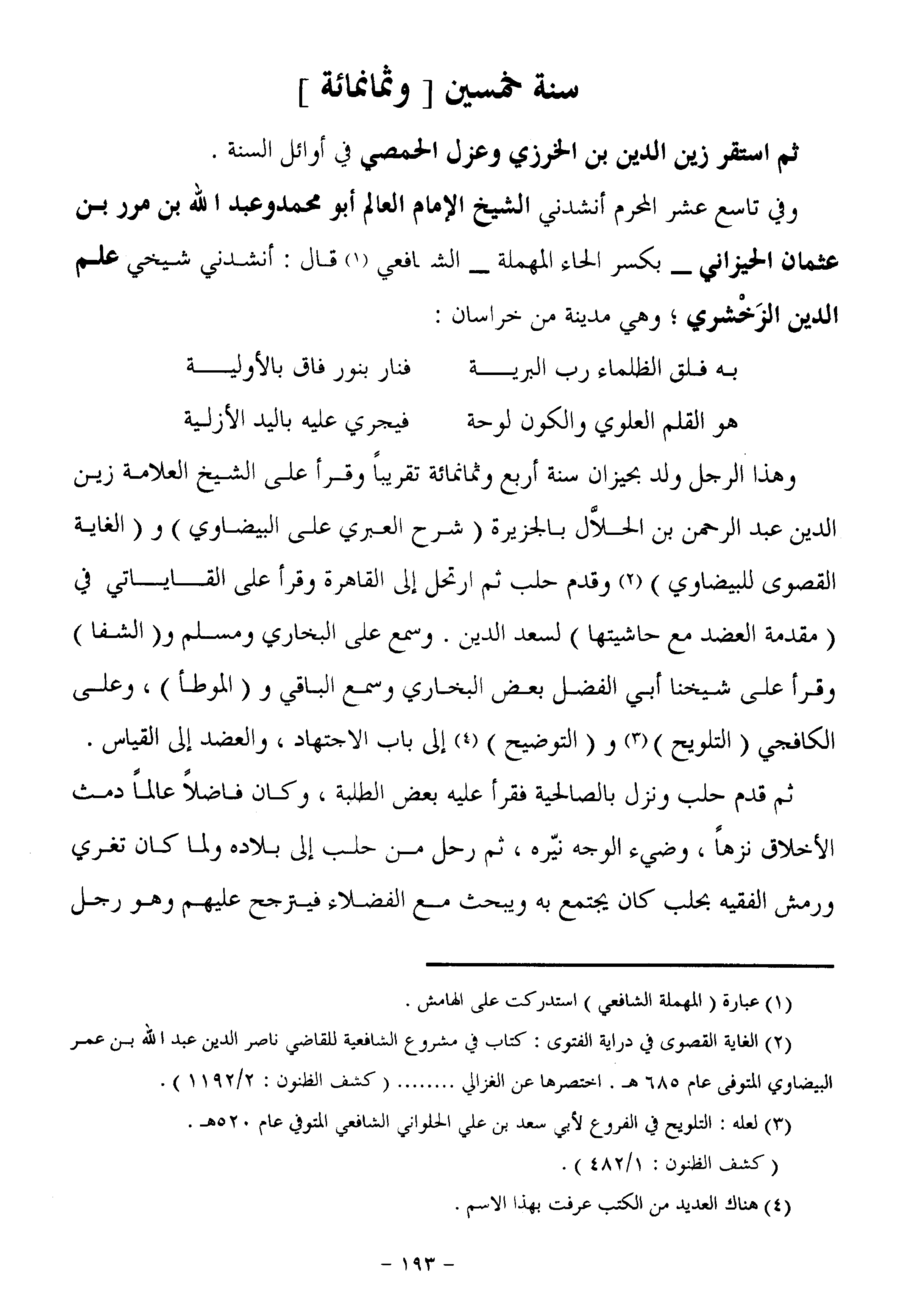 وهذا الرجل ولد بحيزان سنة أربع وثمانمائة تقريبا وقرأ على الشيخ العلامة زين الدين عبد الرحمن بن الحلّال بالجزيرة (شرح العبري على البيضاوي) و (الغاية القصوى للبيضاوي) «2» وقدم حلب ثم ارتحل إلى القاهرة وقرأ على القاياتي في (مقدمة العضد مع حاشيتها) لسعد الدين. وسمع على البخاري ومسلم و (الشفا) وقرأ على شيخنا أبي الفضل بعض البخاري وسمع الباقي و (الموطأ) ، وعلى الكافجي (التلويح) «3» و (التوضيح) «4» إلى باب الاجتهاد، والعضد إلى القياس.