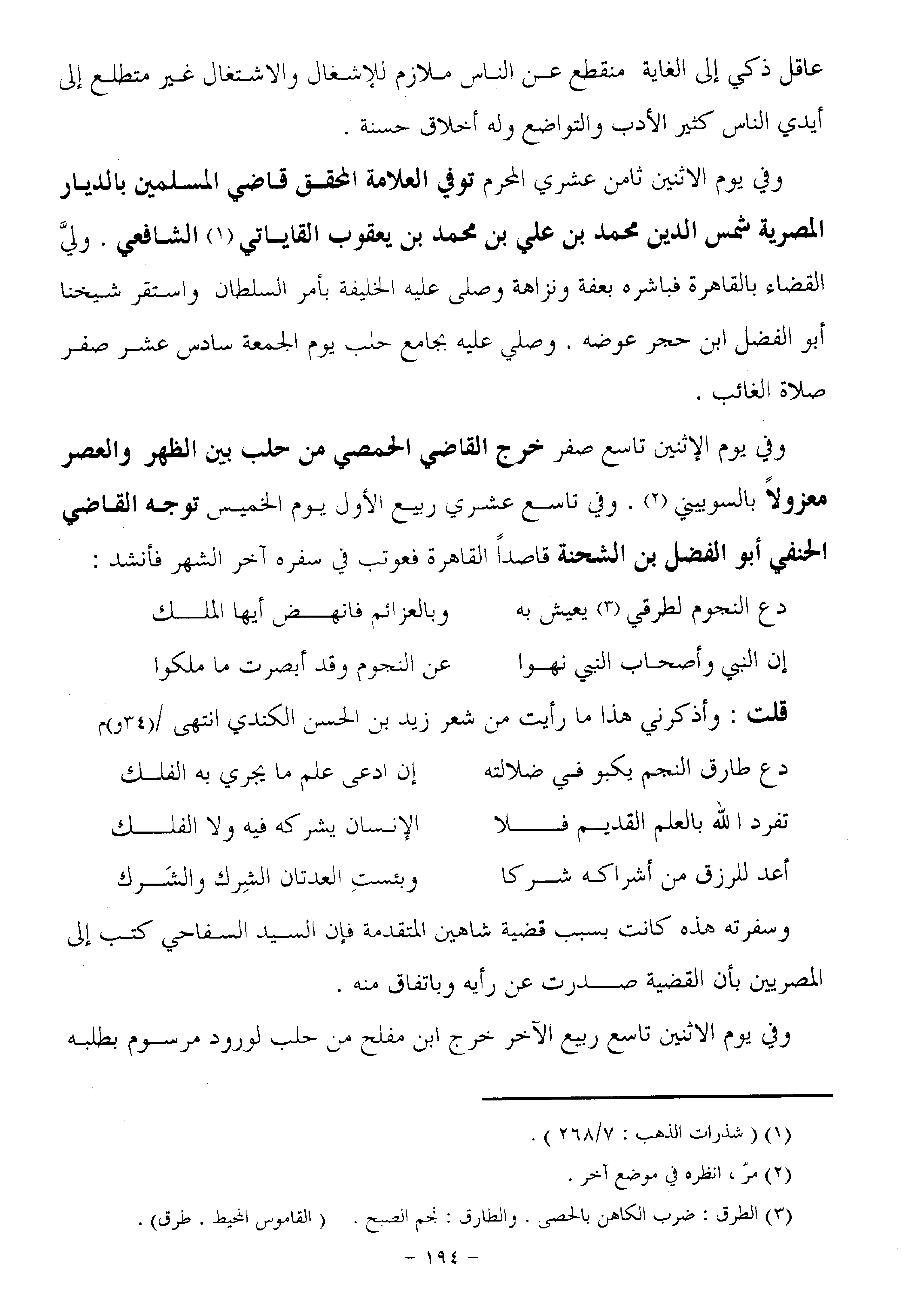 وفي يوم الاثنين تاسع صفر خرج القاضي الحمصي من حلب بين الظهر والعصر معزولا بالسوبيني «2» . وفي تاسع عشري ربيع الأول يوم الخميس توجه القاضي الحنفي أبو الفضل بن الشحنة قاصدا القاهرة فعوتب في سفره آخر الشهر فأنشد: