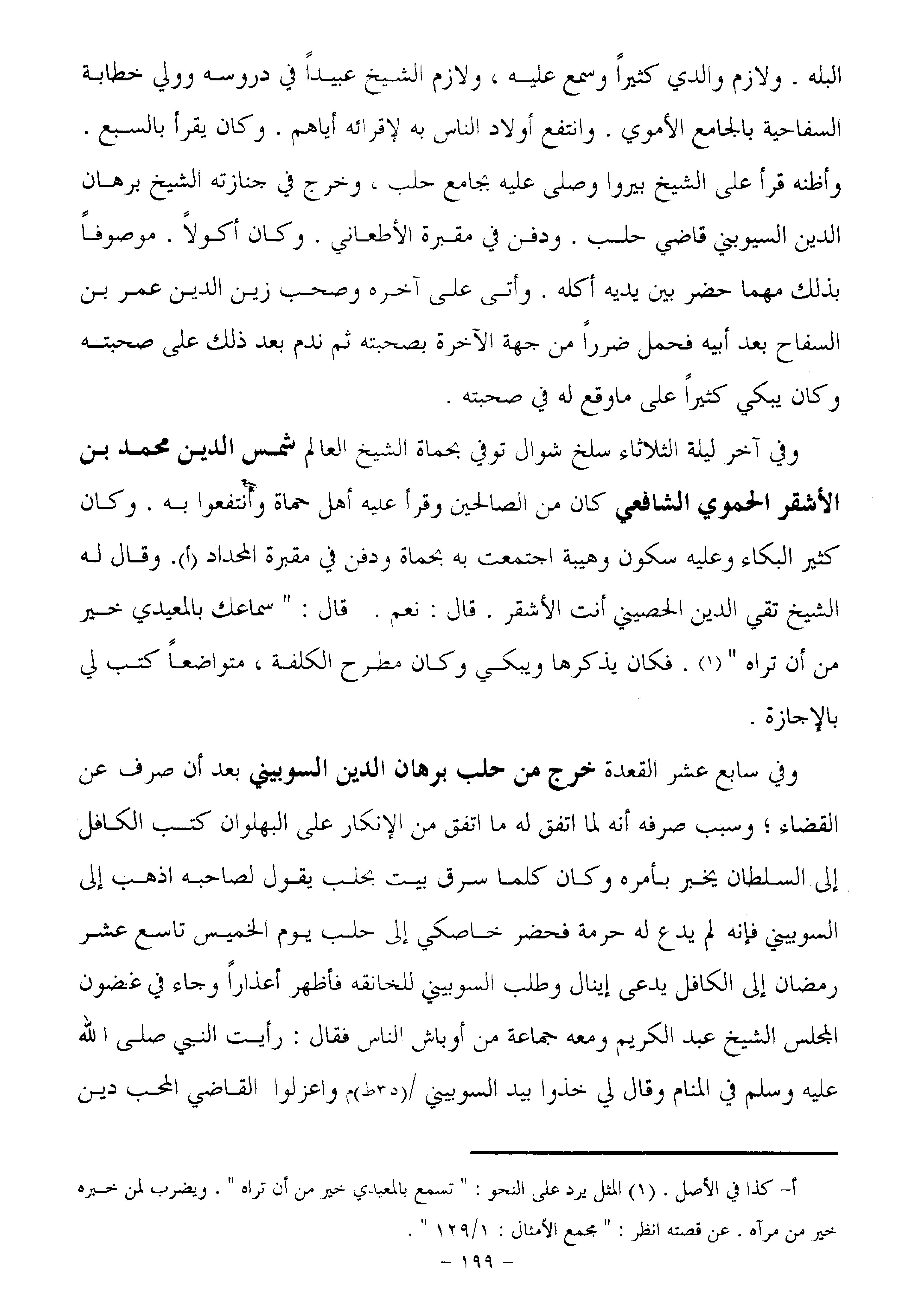 وفي آخر ليلة الثلاثاء سلخ شوال توفي بحماة الشيخ العالم شمس الدين محمد بن الأشقر الحموي الشافعي كان من الصالحين وقرأ عليه أهل حماة وانتفعوا به. وكان كثير البكاء وعليه سكون وهيبة اجتمعت به بحماة ودفن في مقبرة المحداد أ. وقال له الشيخ تقي الدين الحصيني أنت الأشقر. قال: نعم. قال:" سماعك بالمعيدي خير من أن تراه" «1» . فكان يذكرها ويبكي وكان مطرح الكلفة، متواضعا كتب لي بالإجازة.