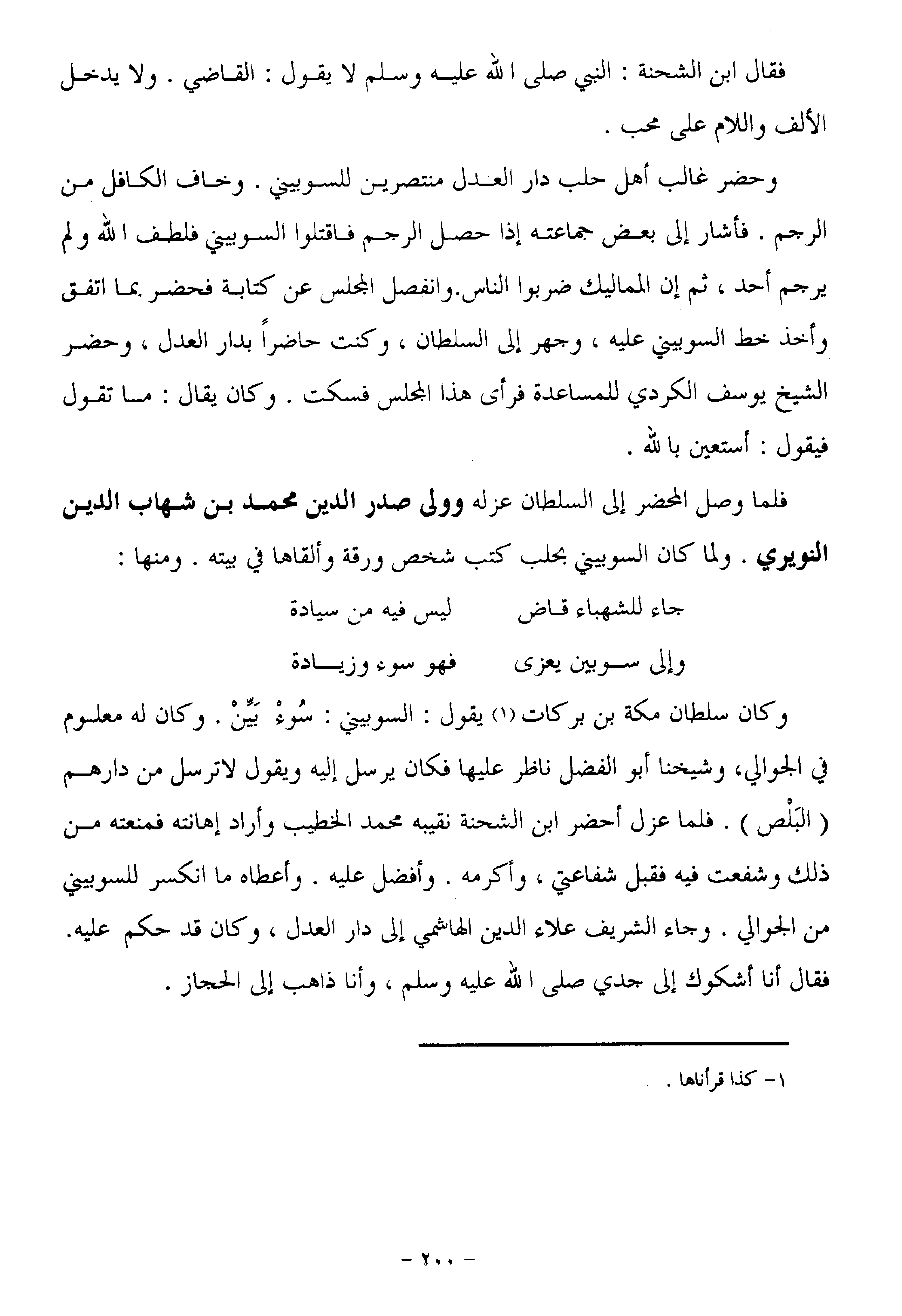 وكان سلطان مكة بن بركات «1» يقول: السوبيني: سوء بيّن. وكان له معلوم في الجوالي، وشيخنا أبو الفضل ناظر عليها فكان يرسل إليه ويقول لا ترسل من دارهم (البلص) . فلما عزل أحضر ابن الشحنة نقيبه محمد الخطيب وأراد إهانته فمنعته من ذلك وشفعت فيه فقبل شفاعتي، وأكرمه. وأفضل عليه. وأعطاه ما انكسر للسوبيني من الجوالي. وجاء الشريف علاء الدين الهاشمي إلى دار العدل، وكان قد حكم عليه.