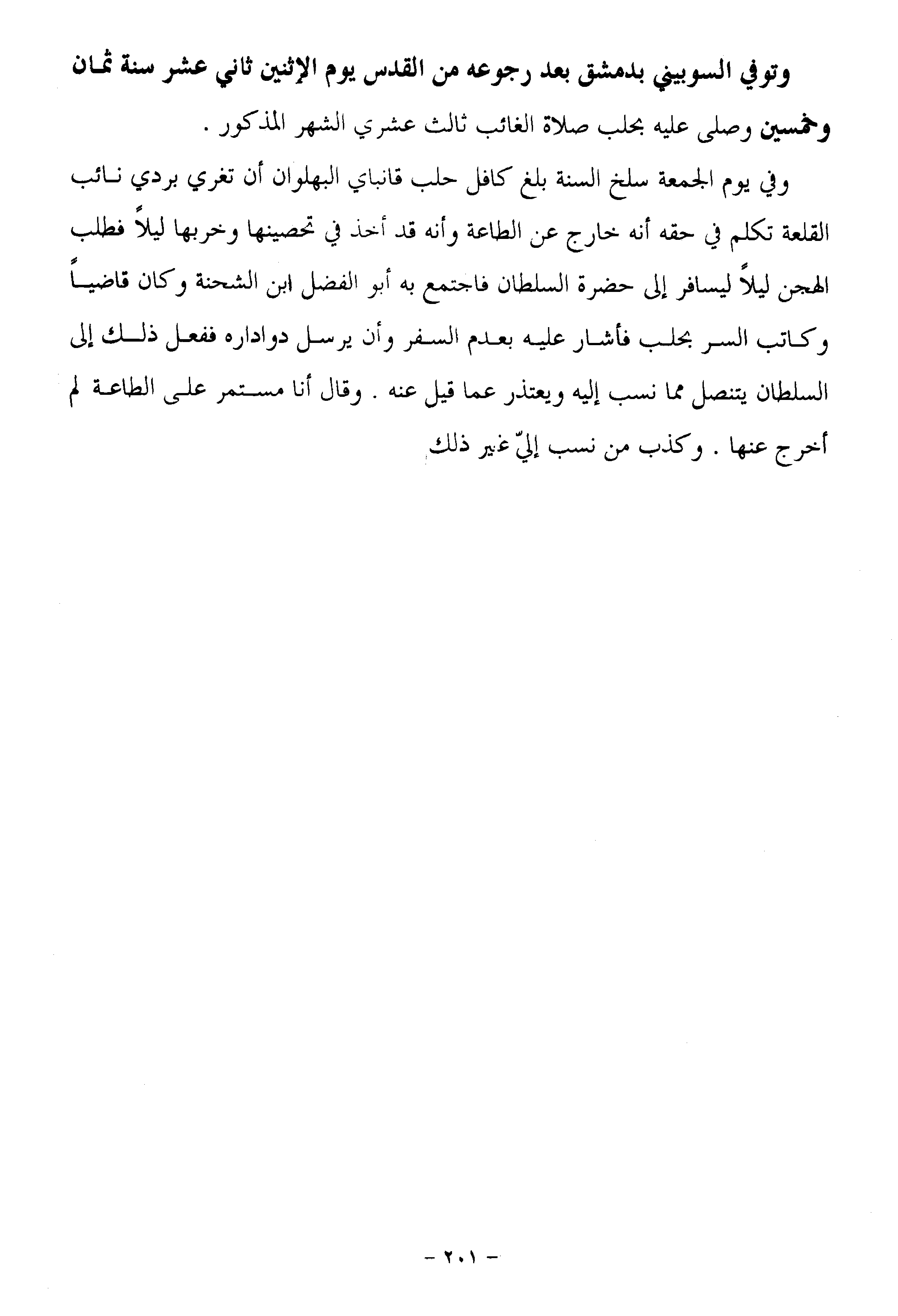 وفي يوم الجمعة سلخ السنة بلغ كافل حلب قانباي البهلوان أن تغري بردي نائب القلعة تكلم في حقه أنه خارج عن الطاعة وأنه قد أخذ في تحصينها وخربها ليلا فطلب الهجن ليلا ليسافر إلى حضرة السلطان فاجتمع به أبو الفضل ابن الشحنة وكان قاضيا وكاتب السر بحلب فأشار عليه بعدم السفر وأن يرسل دواداره ففعل ذلك إلى السلطان يتنصل مما نسب إليه ويعتذر عما قيل عنه. وقال أنا مستمر على الطاعة لم أخرج عنها. وكذب من نسب إليّ غير ذلك.