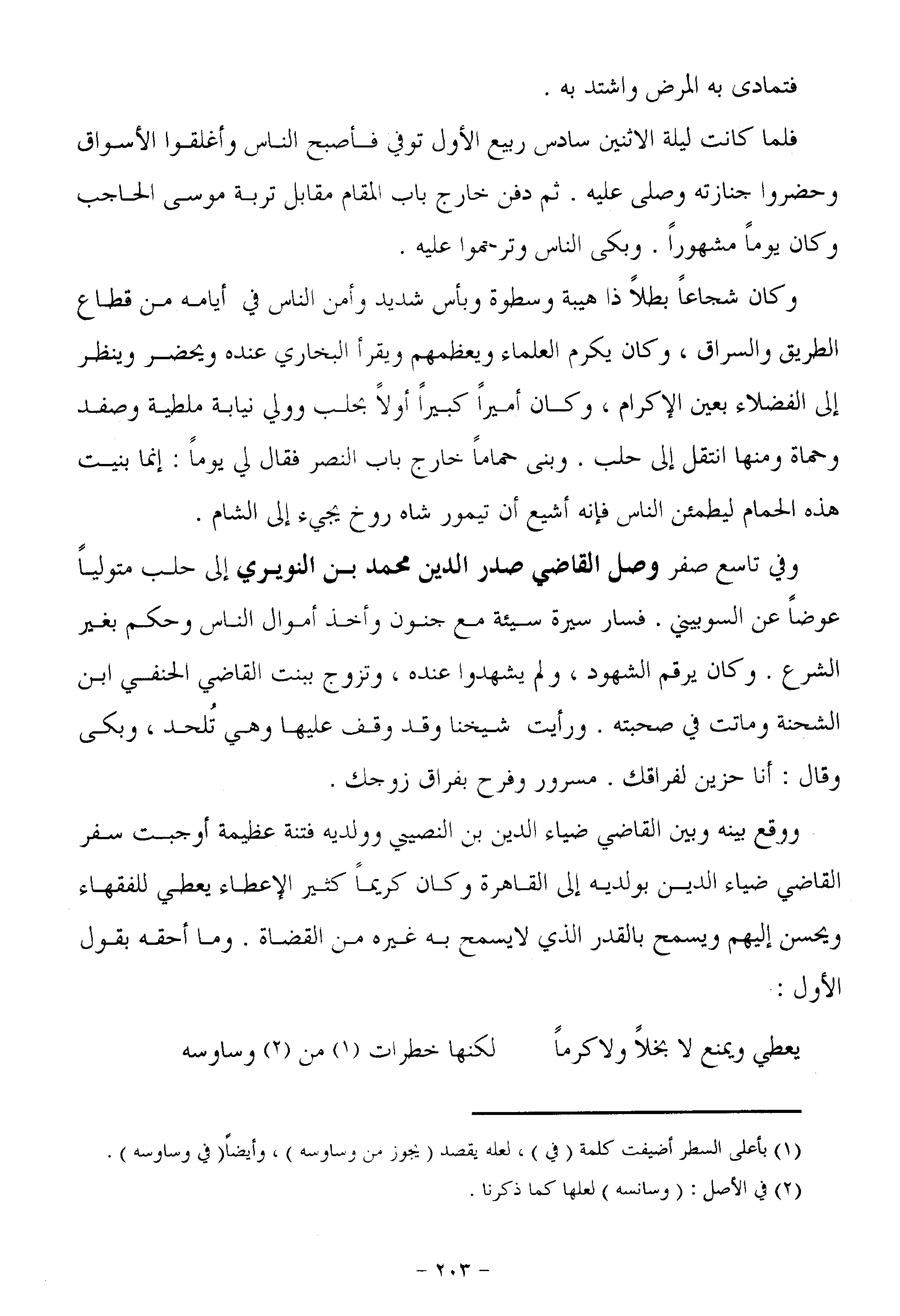 وفي تاسع صفر وصل القاضي صدر الدين محمد بن النويري إلى حلب متوليا عوضا عن السوبيني. فسار سيرة سيئة مع جنون وأخذ أموال الناس وحكم بغير الشرع. وكان يرقم الشهود، ولم يشهدوا عنده، وتزوج ببنت القاضي الحنفي ابن الشحنة وماتت في صحبته. ورأيت شيخنا وقد وقف عليها وهي تلحد، وبكى وقال: أنا حزين لفراقك. مسرور وفرح بفراق زوجك.