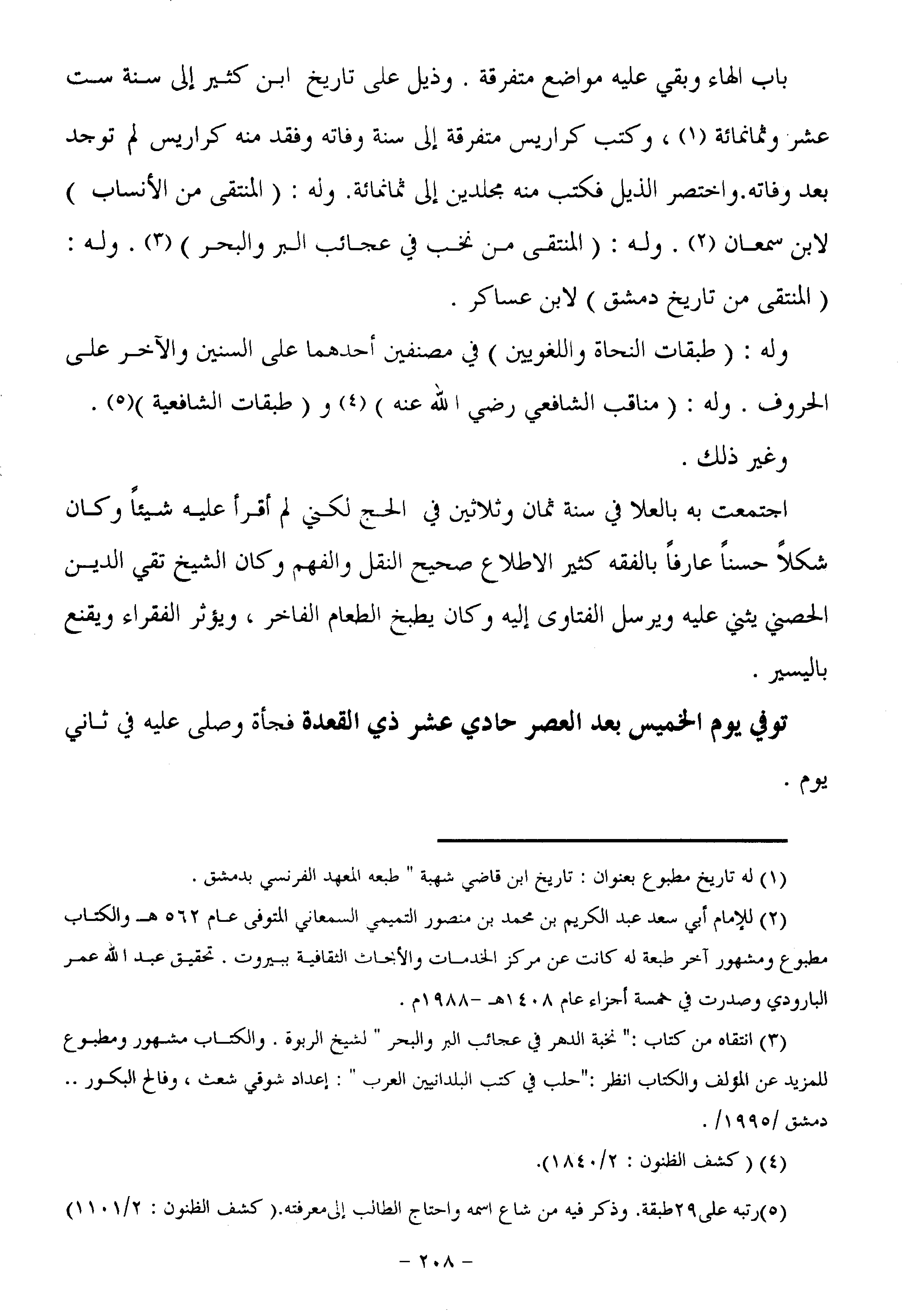 باب الهاء وبقي عليه مواضع متفرقة. وذيل على تاريخ ابن كثير إلى سنة ست عشر وثمانمائة «1» ، وكتب كراريس متفرقة إلى سنة وفاته وفقد منه كراريس لم توجد بعد وفاته. واختصر الذيل فكتب منه مجلدين إلى ثمانمائة. وله: (المنتقى من الأنساب) لابن سمعان «2» . وله: (المنتقى من نخب في عجائب البر والبحر) «3» . وله: