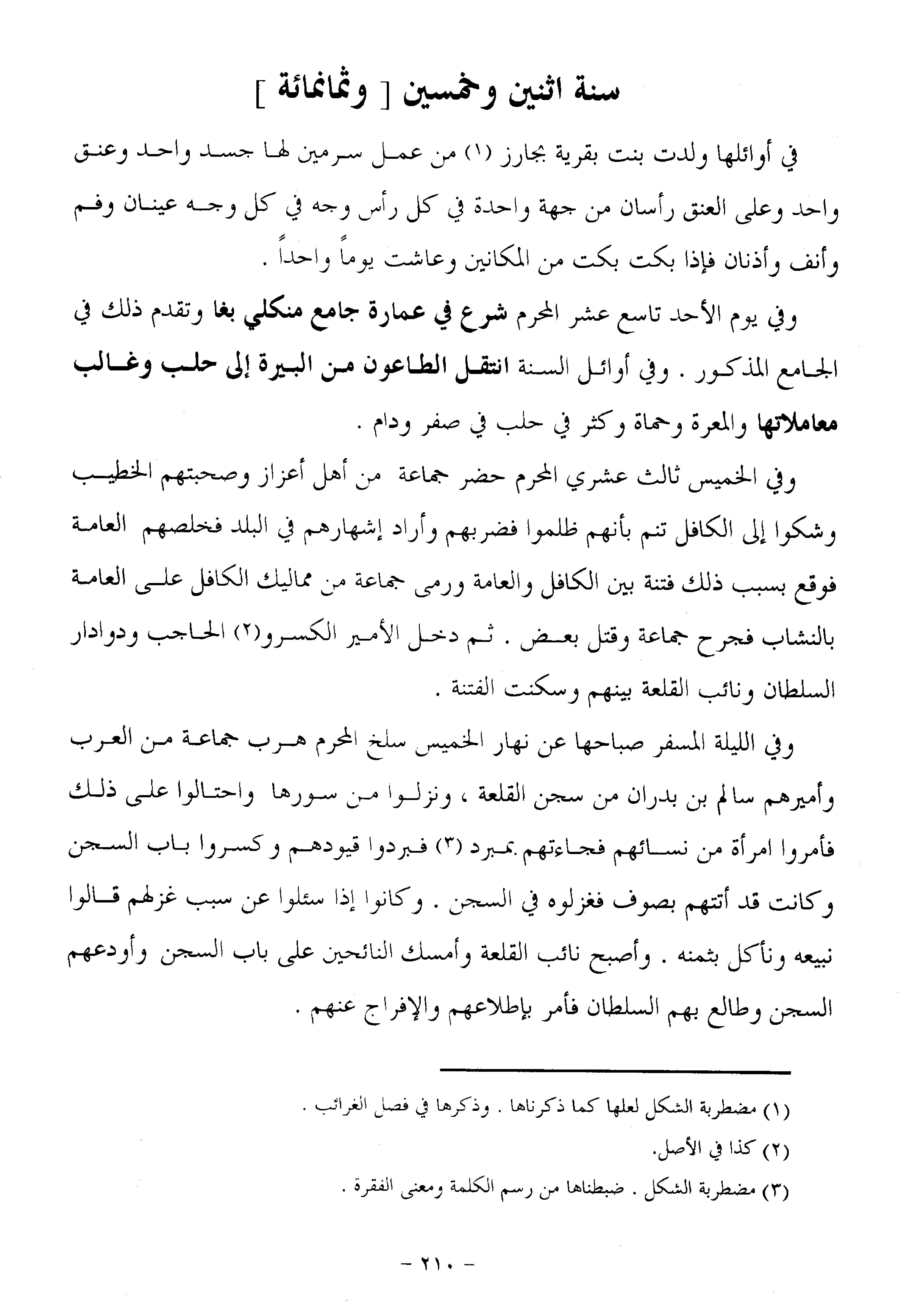 وفي الخميس ثالث عشري المحرم حضر جماعة من أهل أعزاز وصحبتهم الخطيب وشكوا إلى الكافل تنم بأنهم ظلموا فضربهم وأراد إشهارهم في البلد فخلصهم العامة فوقع بسبب ذلك فتنة بين الكافل والعامة ورمى جماعة من مماليك الكافل على العامة بالنشاب فجرح جماعة وقتل بعض. ثم دخل الأمير الكسرو «2» الحاجب ودوادار السلطان ونائب القلعة بينهم وسكنت الفتنة.