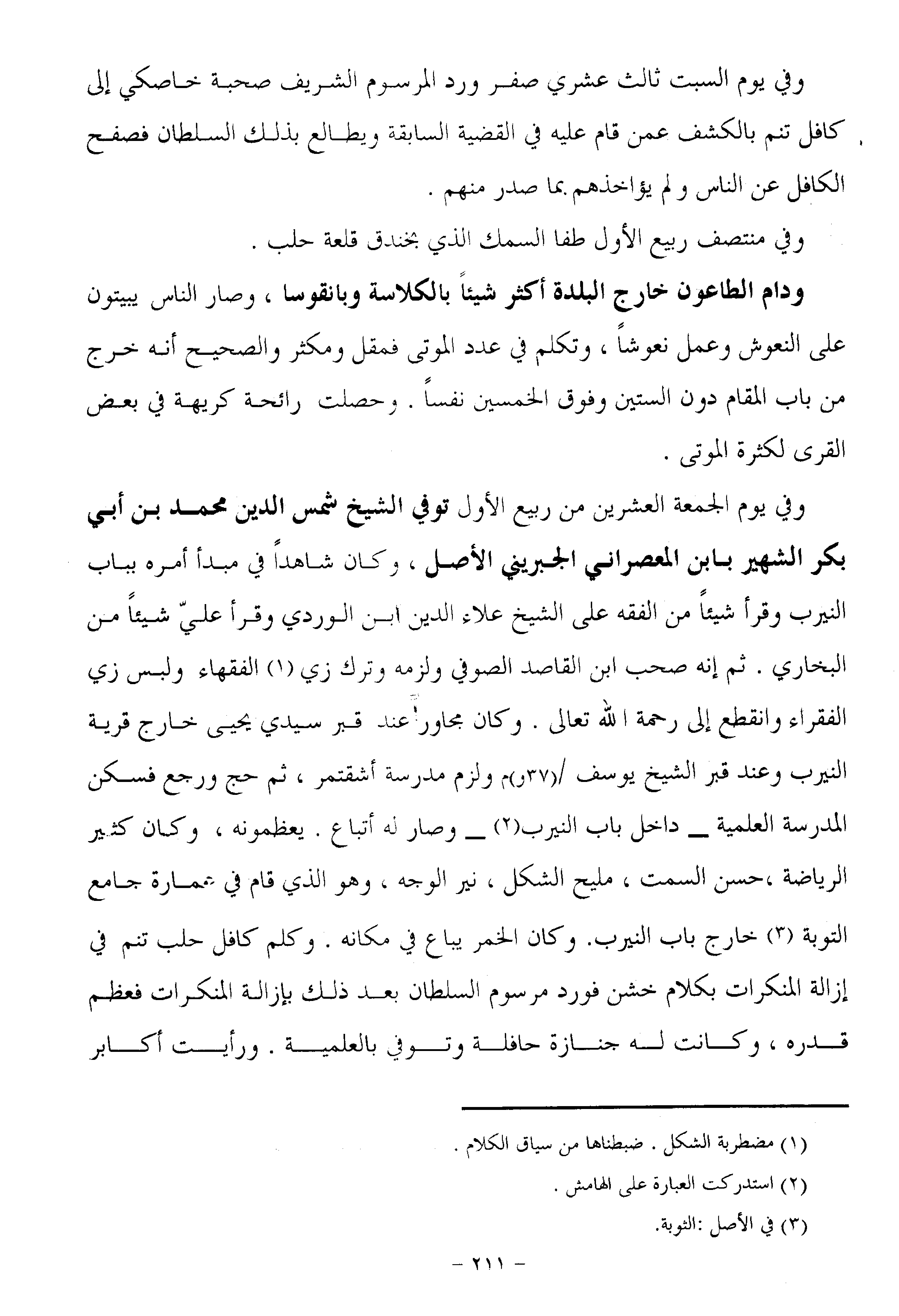 وفي يوم الجمعة العشرين من ربيع الأول توفي الشيخ شمس الدين محمد بن أبي بكر الشهير بابن المعصراني الجبريني الأصل، وكان شاهدا في مبدأ أمره بباب النيرب وقرأ شيئا من الفقه على الشيخ علاء الدين ابن الوردي وقرأ عليّ شيئا من البخاري. ثم إنه صحب ابن القاصد الصوفي ولزمه وترك زي «1» الفقهاء ولبس زي الفقراء وانقطع إلى رحمة الله تعالى. وكان مجاورا عند قبر سيدي يحيى خارج قرية النيرب وعند قبر الشيخ يوسف/ (37 و) م ولزم مدرسة أشقتمر، ثم حج ورجع فسكن المدرسة العلمية- داخل باب النيرب «2» - وصار له أتباع. يعظمونه، وكان كثير الرياضة، حسن السمت، مليح الشكل، نير الوجه، وهو الذي قام في عمارة جامع التوبة «3» خارج باب النيرب. وكان الخمر يباع في مكانه. وكلم كافل حلب تنم في إزالة المنكرات بكلام خشن فورد مرسوم السلطان بعد ذلك بإزالة المنكرات فعظم قدره، وكانت له جنازة حافلة وتوفي بالعلمية. ورأيت أكابر