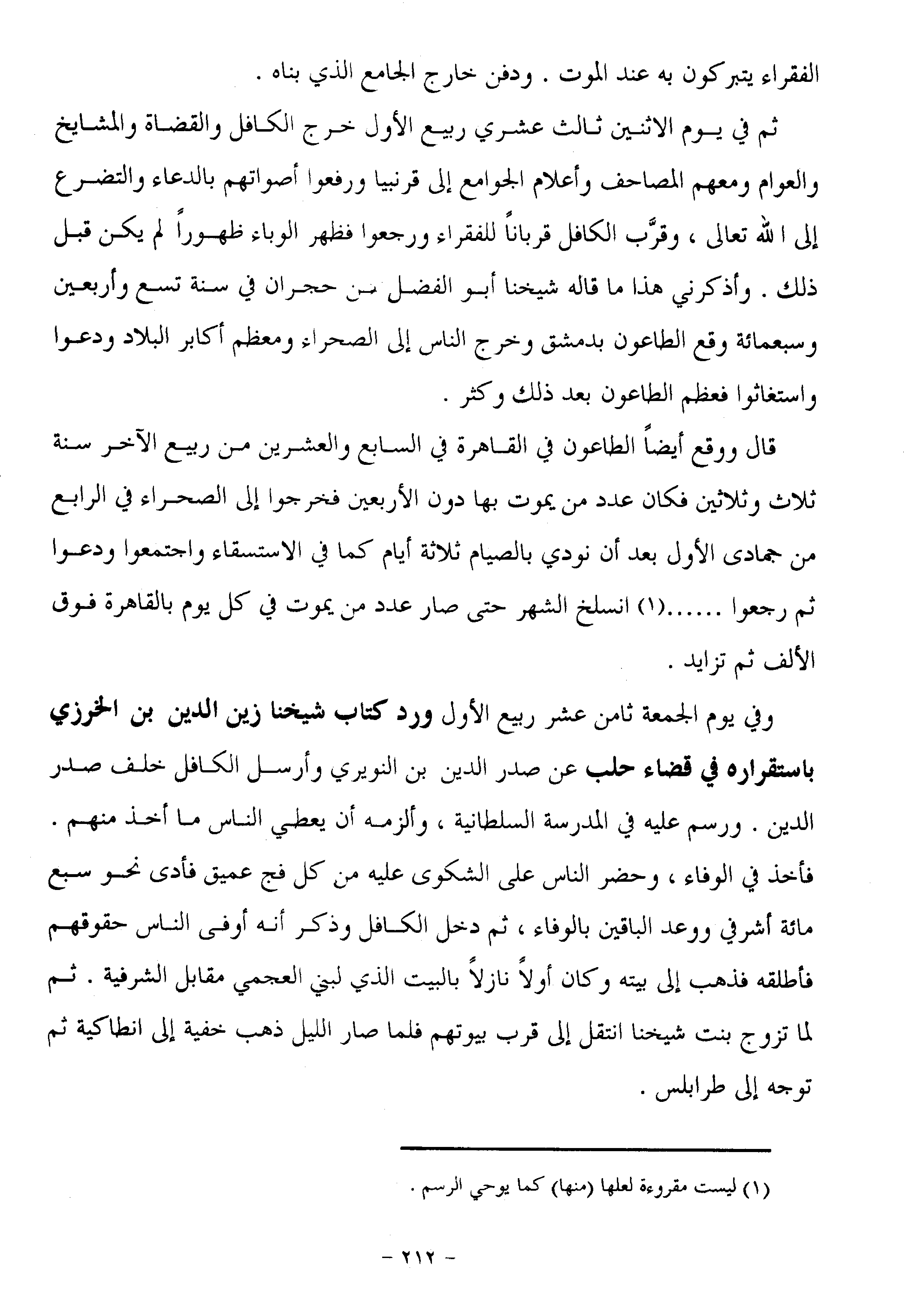 ثم في يوم الاثنين ثالث عشري ربيع الأول خرج الكافل والقضاة والمشايخ والعوام ومعهم المصاحف وأعلام الجوامع إلى قرنبيا ورفعوا أصواتهم بالدعاء والتضرع إلى الله تعالى، وقرّب الكافل قربانا للفقراء ورجعوا فظهر الوباء ظهورا لم يكن قبل ذلك. وأذكرني هذا ما قاله شيخنا أبو الفضل بن حجران في سنة تسع وأربعين وسبعمائة وقع الطاعون بدمشق وخرج الناس إلى الصحراء ومعظم أكابر البلاد ودعوا واستغاثوا فعظم الطاعون بعد ذلك وكثر.