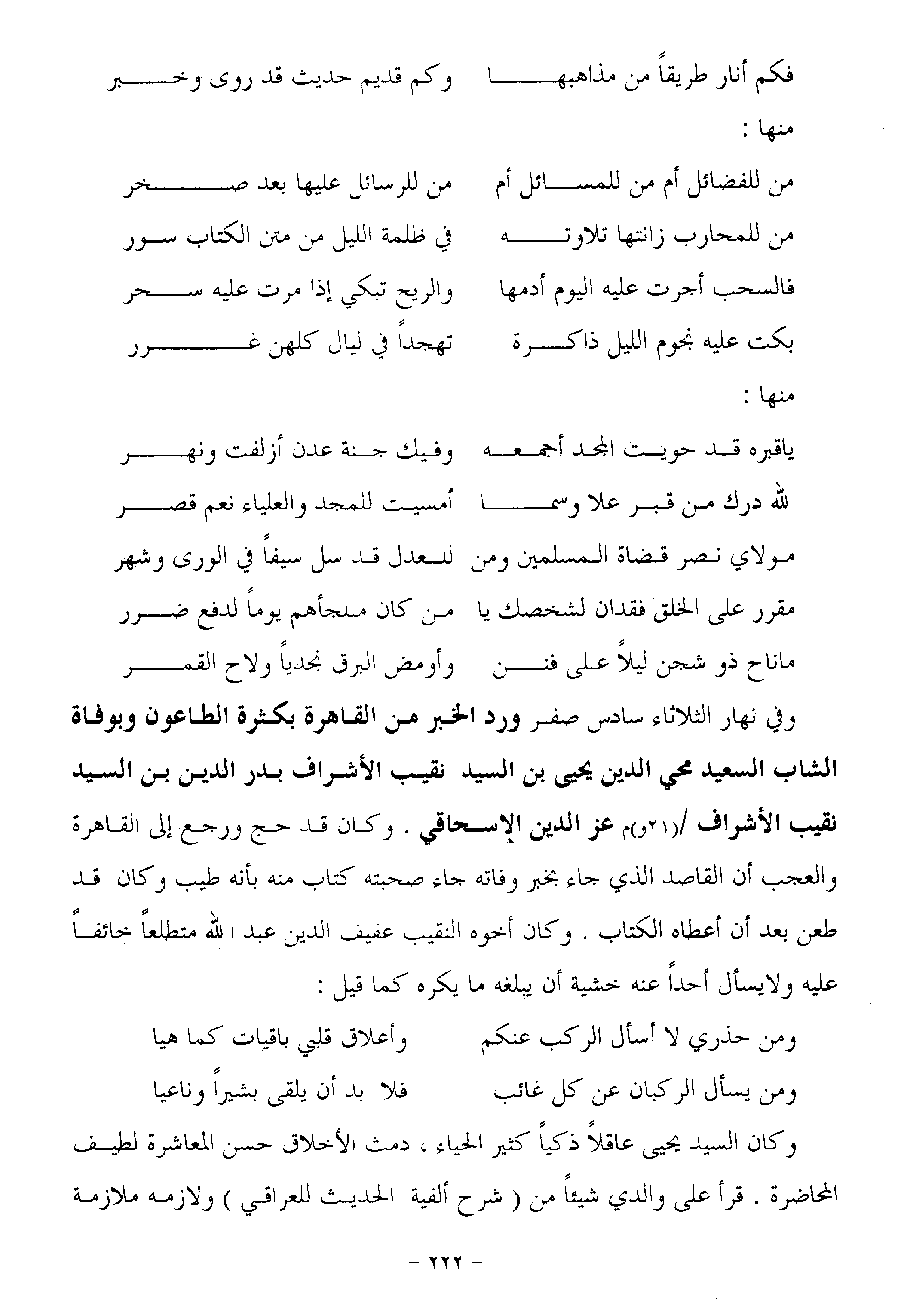 وفي نهار الثلاثاء سادس صفر ورد الخبر من القاهرة بكثرة الطاعون وبوفاة الشاب السعيد محي الدين يحيى بن السيد نقيب الأشراف بدر الدين بن السيد نقيب الأشراف/ (21 و) م عز الدين الإسحاقي. وكان قد حج ورجع إلى القاهرة والعجب أن القاصد الذي جاء بخبر وفاته جاء صحبته كتاب منه بأنه طيب وكان قد طعن بعد أن أعطاه الكتاب. وكان أخوه النقيب عفيف الدين عبد الله متطلعا خائفا عليه ولا يسأل أحدا عنه خشية أن يبلغه ما يكره كما قيل: