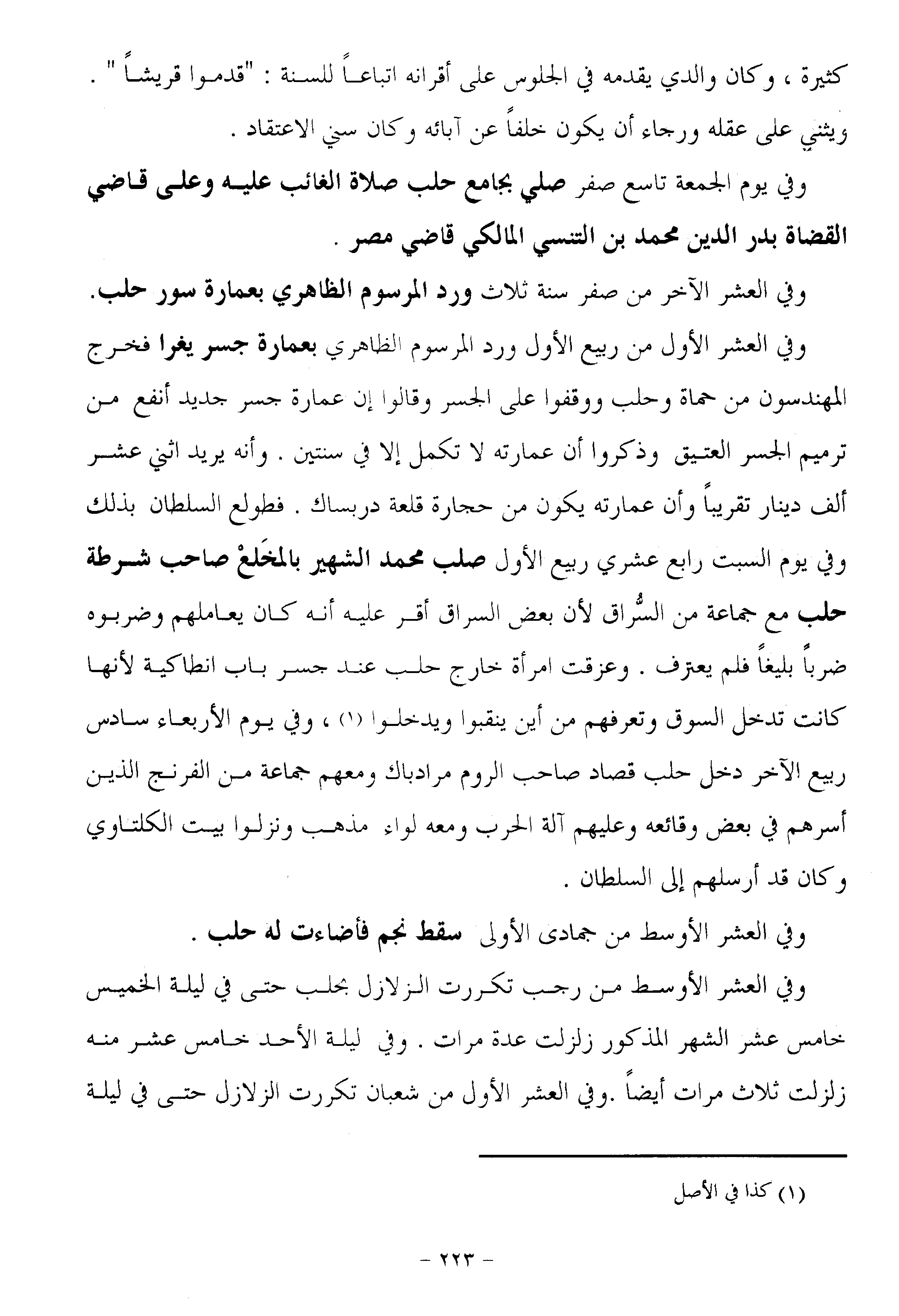 وفي العشر الأول من ربيع الأول ورد المرسوم الظاهري بعمارة جسر يغرا فخرج المهندسون من حماة وحلب ووقفوا على الجسر وقالوا إن عمارة جسر جديد أنفع من ترميم الجسر العتيق وذكروا أن عمارته لا تكمل إلا في سنتين. وأنه يريد اثني عشر ألف دينار تقريبا وأن عمارته يكون من حجارة قلعة دربساك. فطولع السلطان بذلك وفي يوم السبت رابع عشري ربيع الأول صلب محمد الشهير بالمخلع صاحب شرطة حلب مع جماعة من السّراق لأن بعض السراق أقر عليه أنه كان يعاملهم وضربوه ضربا بليغا فلم يعترف. وعزقت امرأة خارج حلب عند جسر باب انطاكية لأنها كانت تدخل السوق وتعرفهم من أين ينقبوا ويدخلوا «1» ، وفي يوم الأربعاء سادس ربيع الآخر دخل حلب قصاد صاحب الروم مرادباك ومعهم جماعة من الفرنج الذين أسرهم في بعض وقائعه وعليهم آلة الحرب ومعه لواء مذهب ونزلوا بيت الكلتاوي وكان قد أرسلهم إلى السلطان.