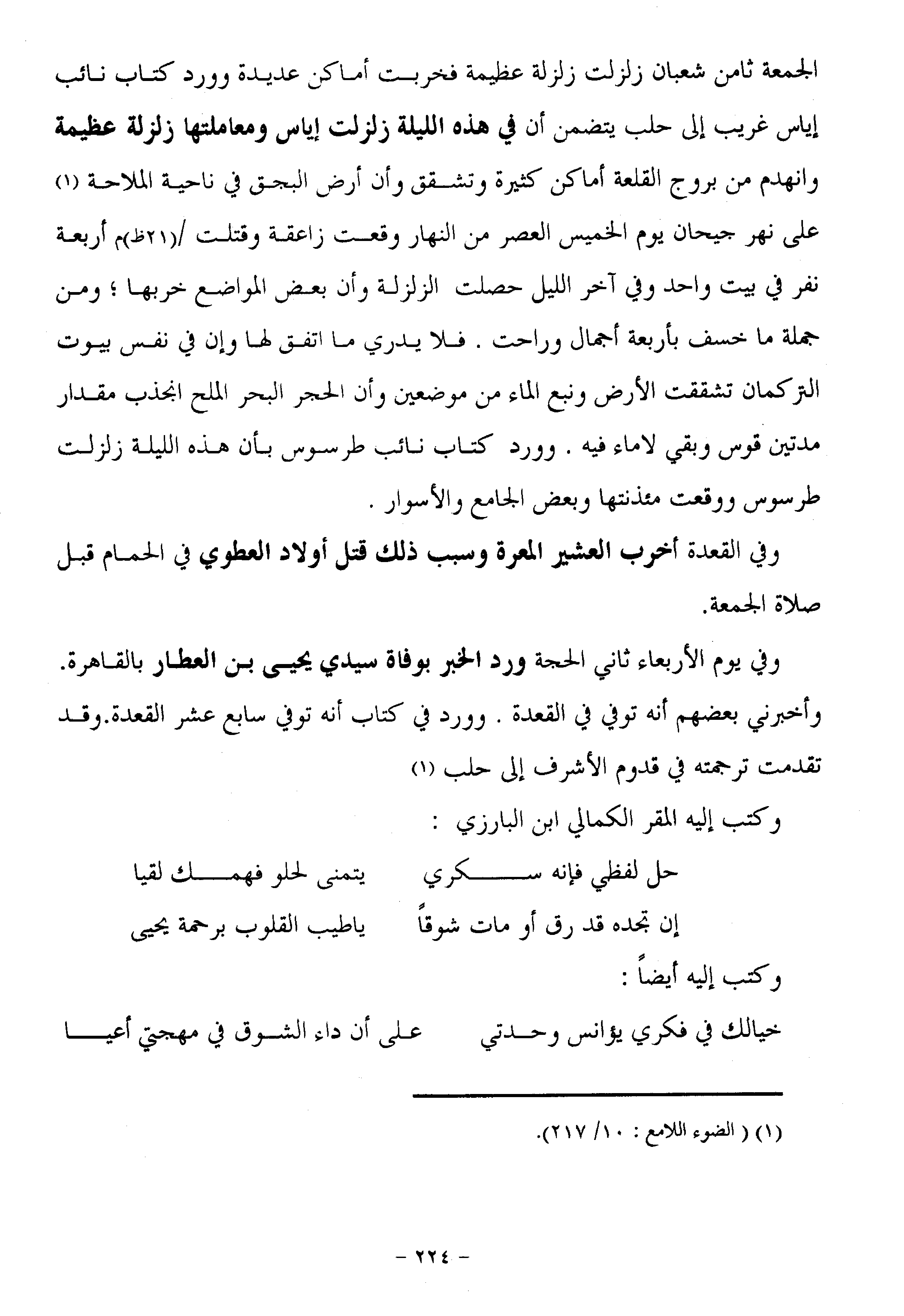 الجمعة ثامن شعبان زلزلت زلزلة عظيمة فخربت أماكن عديدة وورد كتاب نائب إياس غريب إلى حلب يتضمن أن في هذه الليلة زلزلت إياس ومعاملتها زلزلة عظيمة وانهدم من بروج القلعة أماكن كثيرة وتشقق وأن أرض البجق في ناحية الملاحة «1» على نهر جيحان يوم الخميس العصر من النهار وقعت زاعقة وقتلت/ (21 ظ) م أربعة نفر في بيت واحد وفي آخر الليل حصلت الزلزلة وأن بعض المواضع خربها؛ ومن جملة ما خسف بأربعة أجمال وراحت. فلا يدري ما اتفق لها وإن في نفس بيوت التركمان تشققت الأرض ونبع الماء من موضعين وأن الحجر البحر الملح انجذب مقدار مدتين قوس وبقي لا ماء فيه. وورد كتاب نائب طرسوس بأن هذه الليلة زلزلت طرسوس ووقعت مئذنتها وبعض الجامع والأسوار.