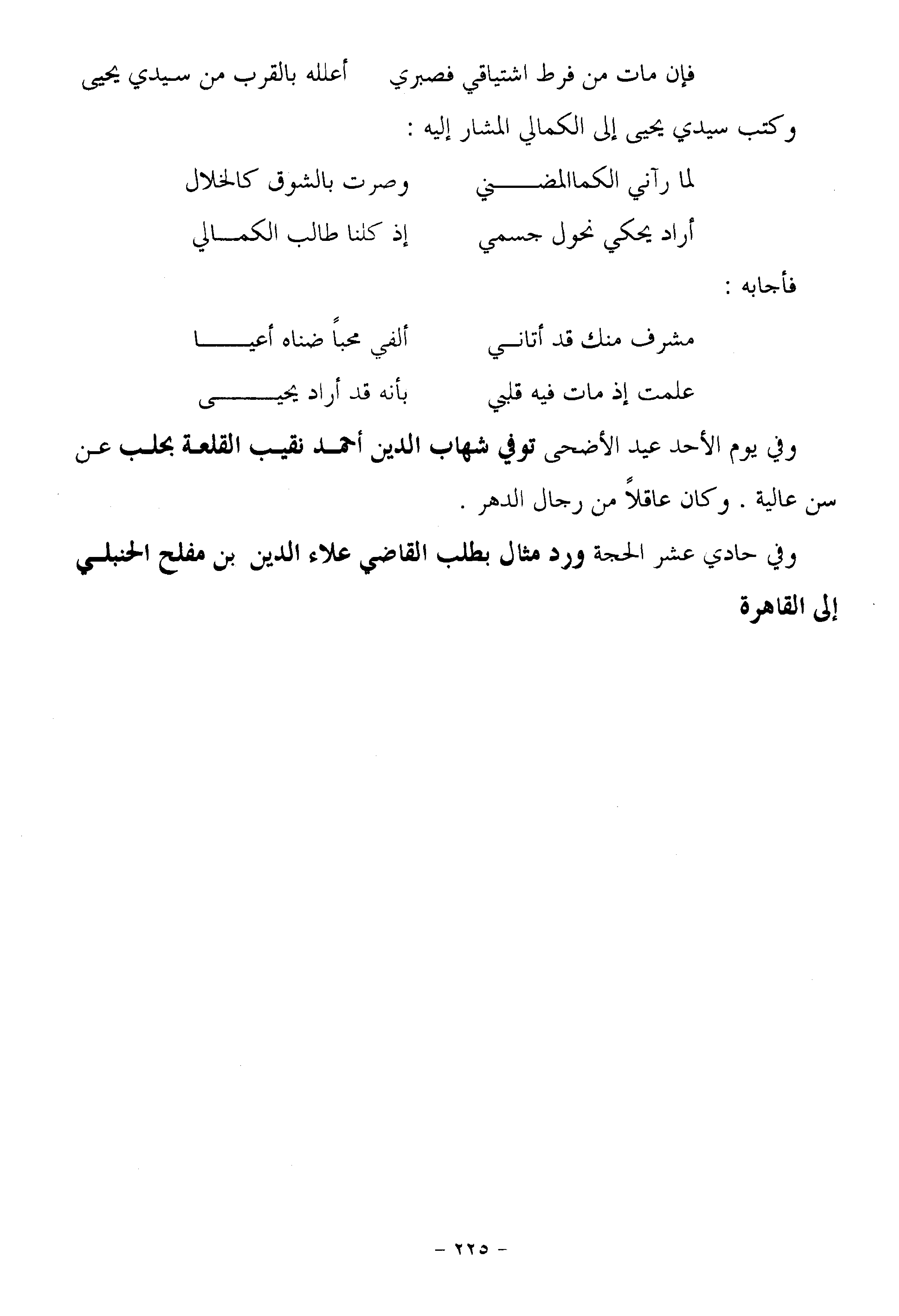 وفي يوم الأحد عيد الأضحى توفي شهاب الدين أحمد نقيب القلعة بحلب عن سن عالية. وكان عاقلا من رجال الدهر.
