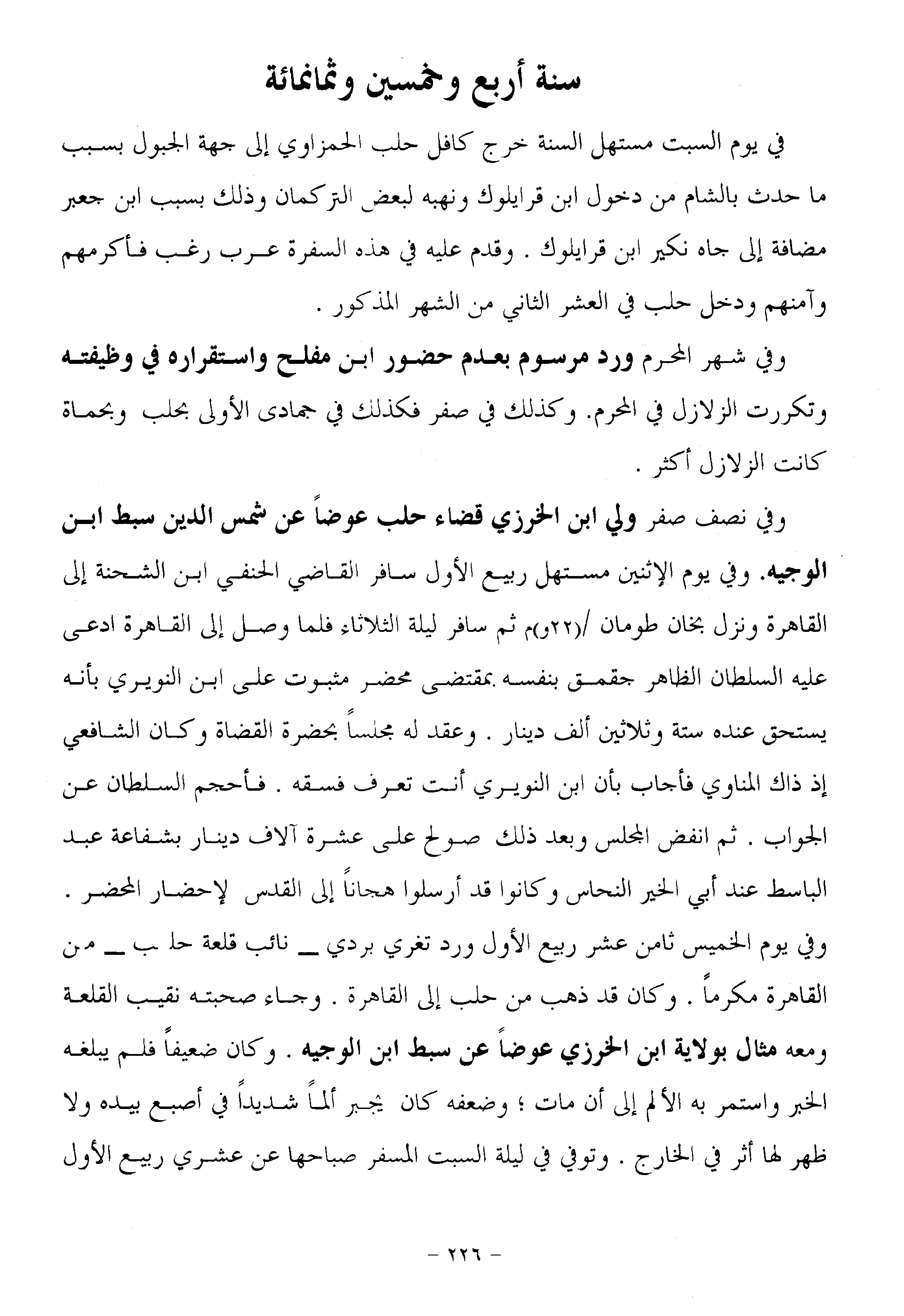 وفي شهر المحرم ورد مرسوم بعدم حضور ابن مفلح واستقراره في وظيفته وتكررت الزلازل في المحرم. وكذلك في صفر فكذلك في جمادى الأولى بحلب وبحماة كانت الزلازل أكثر.