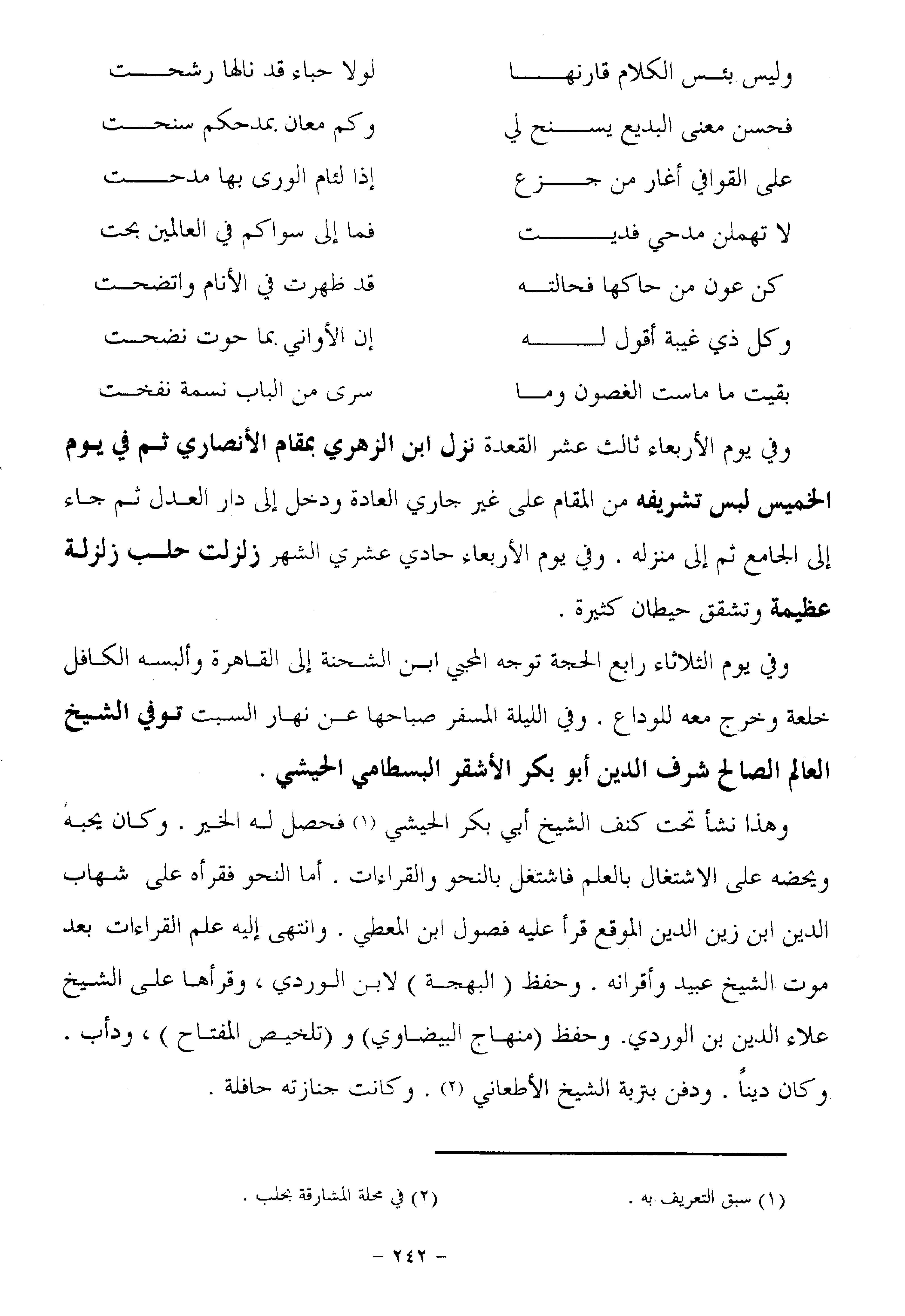 وفي يوم الأربعاء ثالث عشر القعدة نزل ابن الزهري بمقام الأنصاري ثم في يوم الخميس لبس تشريفه من المقام على غير جاري العادة ودخل إلى دار العدل ثم جاء إلى الجامع ثم إلى منزله. وفي يوم الأربعاء حادي عشري الشهر زلزلت حلب زلزلة عظيمة وتشقق حيطان كثيرة.
