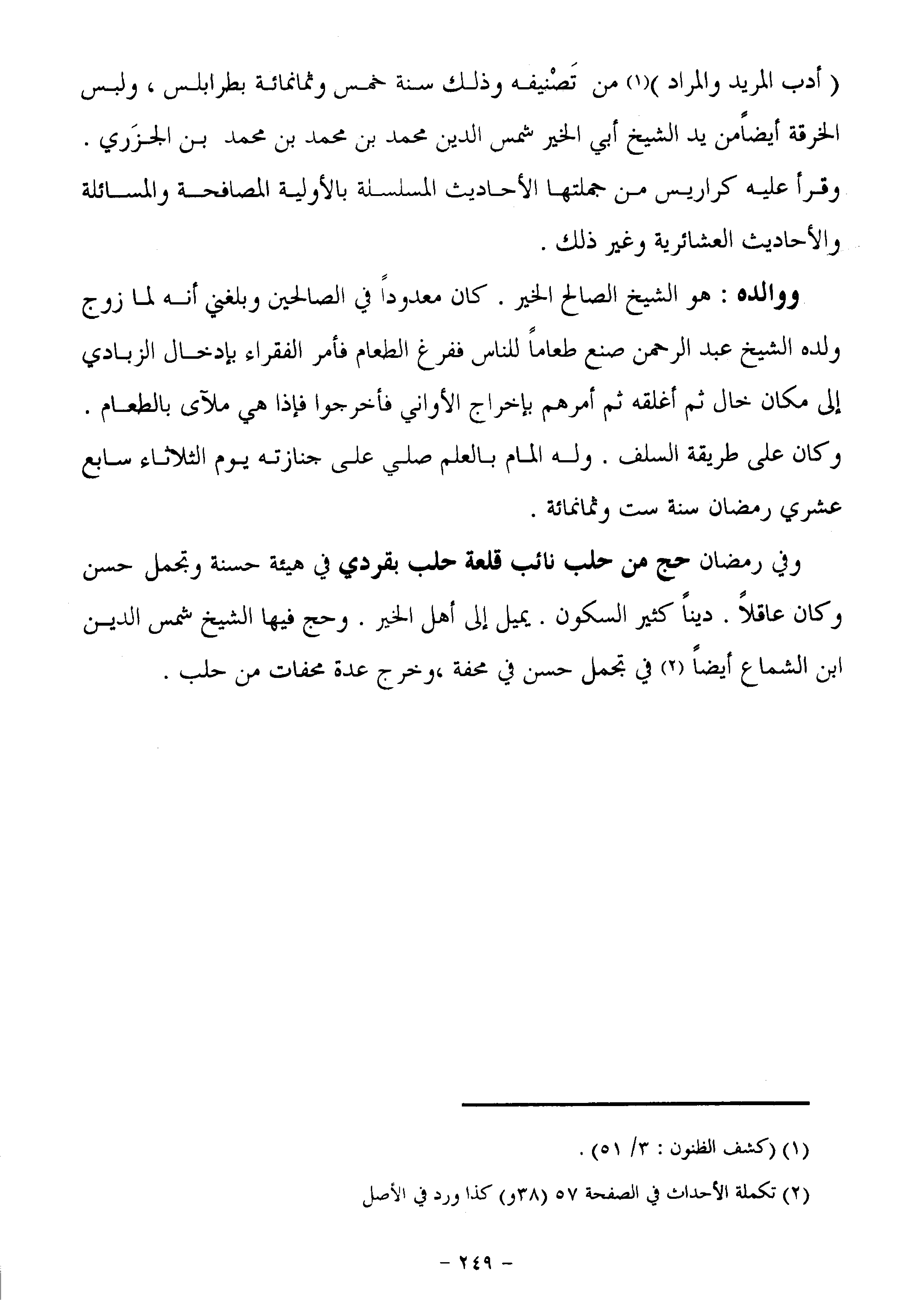 (أدب المريد والمراد) «1» من تصنيفه وذلك سنة خمس وثمانمائة بطرابلس، ولبس الخرقة أيضا من يد الشيخ أبي الخير شمس الدين محمد بن محمد بن محمد بن الجزري.